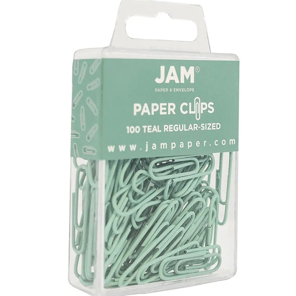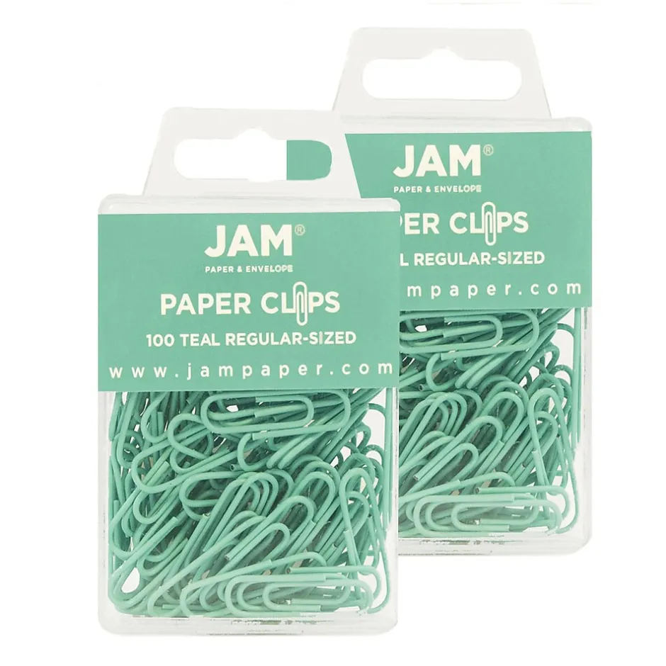 JAM PaperĀ® Small Teal Colored Standard Paper Clips are stylish, fun, and functional! Each box contains a total of 100 paperclips! Each one is made out of sturdy steel wire and is coated in bright real colored vinyl! These small paper clips measure 1 inch in length each. Simultaneously bring color and order to your office or work space with these reliable teal paper clips. Use then to reliably clip together notes, documents, memos, files, receipts, invoices, checks, cash, photos, lists, itineraries, and other papers together with ease! If teal or light blue is your favorite color, you’ll enjoy the freedom of self-expression that these paperclips provide! If your desk of workspace is looking cluttered, you’ll appreciate how easy these clips make it to keep your documents in order. Size: Small , Color: Teal , Quantity: 2/pack