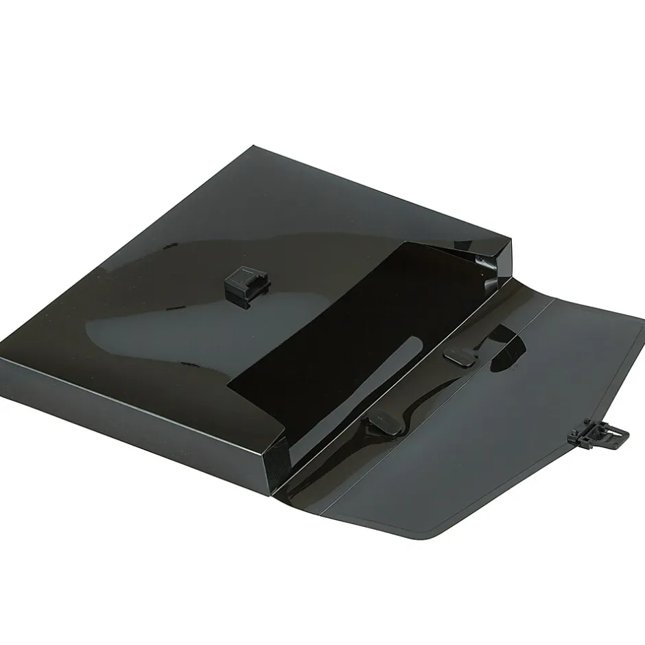 JAM PaperĀ® Black Plastic Portfolio Briefcase with Handles measures 12 x 9.5 x 1.5 inches in size and is made out of smooth, durable poly plastic. Featuring a solid black color, this case will appear professional in any office or academic setting and will keep the contents inside of it hidden from sight. To make carrying it from place to place simple and easy, this portfolio has a black plastic handle. It opens up in the front with a vflap and closes with a black plastic closure. This case is sold individually. Use it to store, protect, and carry your important documents. Whether you need to carry files to your office, spreadsheets to that next meeting, or advertising materials to a sales call, this portfolio will help you get the job done.