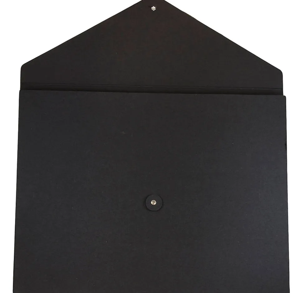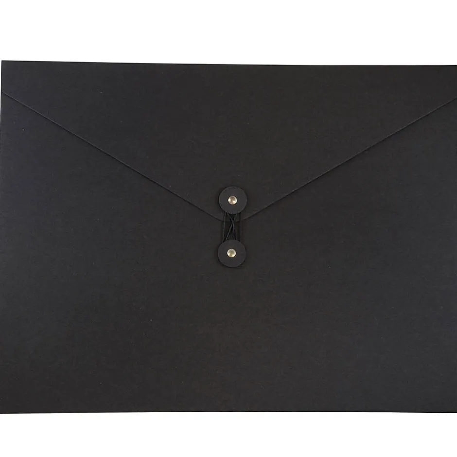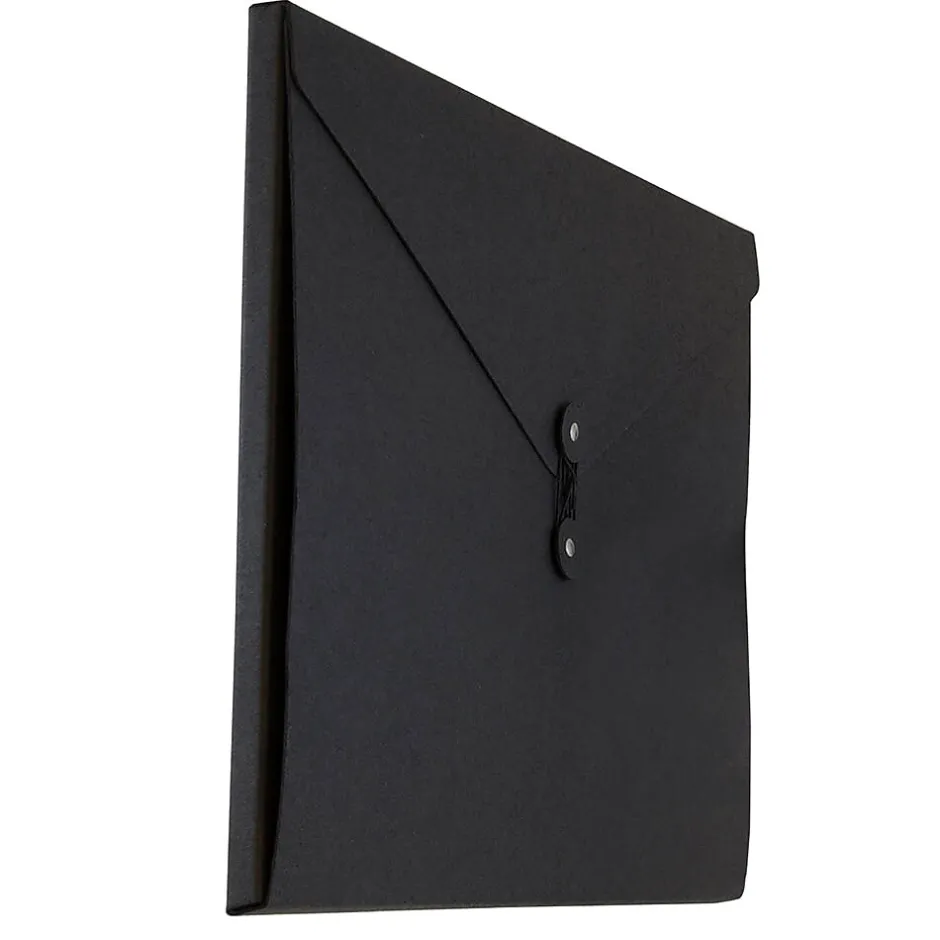 JAM PaperĀ® Black Jumbo Recycled Kraft Portfolio with Button and String Closure measures 12.5 x 16.5 x 0.5 inches in size and is made out of durable, smooth, earth friendly, 100% recycled chipboard! This portfolio is sold individually and features a professional jet black color that looks great in any work space or office! For easy opening and secure closing, this portfolio has a vflap and a reliable two-button and string-tie closure. Both buttons of this closure match the surface of the case and the string is also jet black. The large size of this portfolio makes it excellent for carrying all of your important documents, projects, and small office supplies safely from place to place!