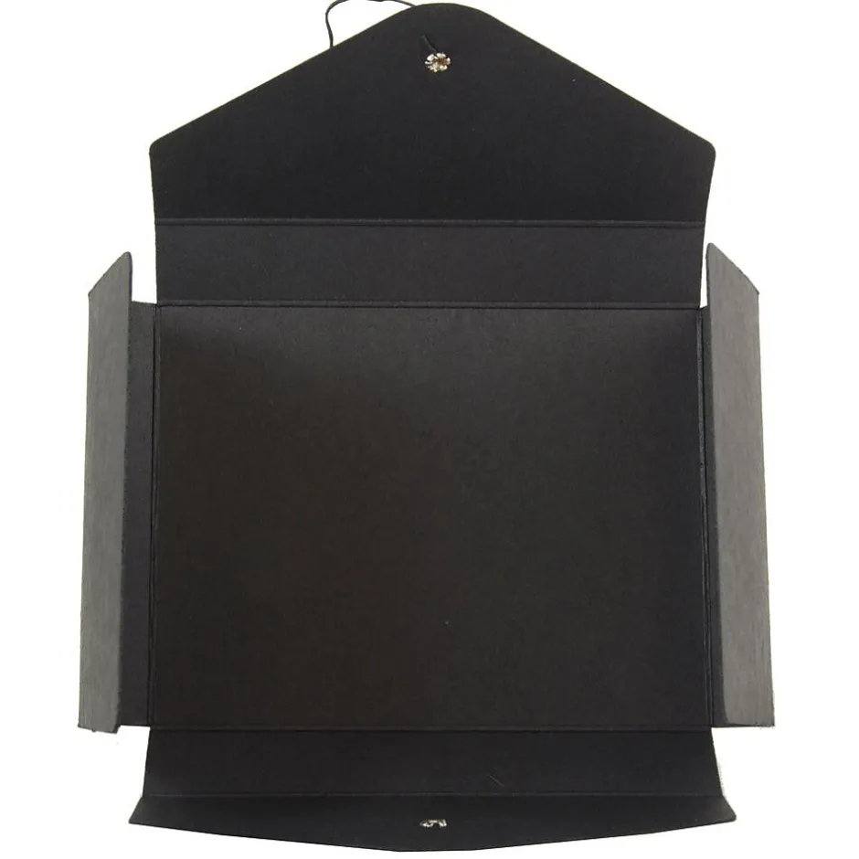 JAM PaperĀ® Black Recycled Small Kraft Portfolio with Button and String Tie Closure is made out of smooth, durable, and environmentally friendly 100% recycled chipboard. This portfolio case is sold individually and measures 5.25 x 6.75 x 1 inches in size. It is the ideal case for carrying and protecting index cards, small memos, and small office supplies such as pens or pencils in your office or workspace. Certain to appear professional in any environment, this portfolio features a jet black color and a vflap opening. To keep it securely closed, it features a two-button and string-tie closure. The buttons of this closure match the surface of the case in color and in material. The string that wraps arou8nd them is also jet black.