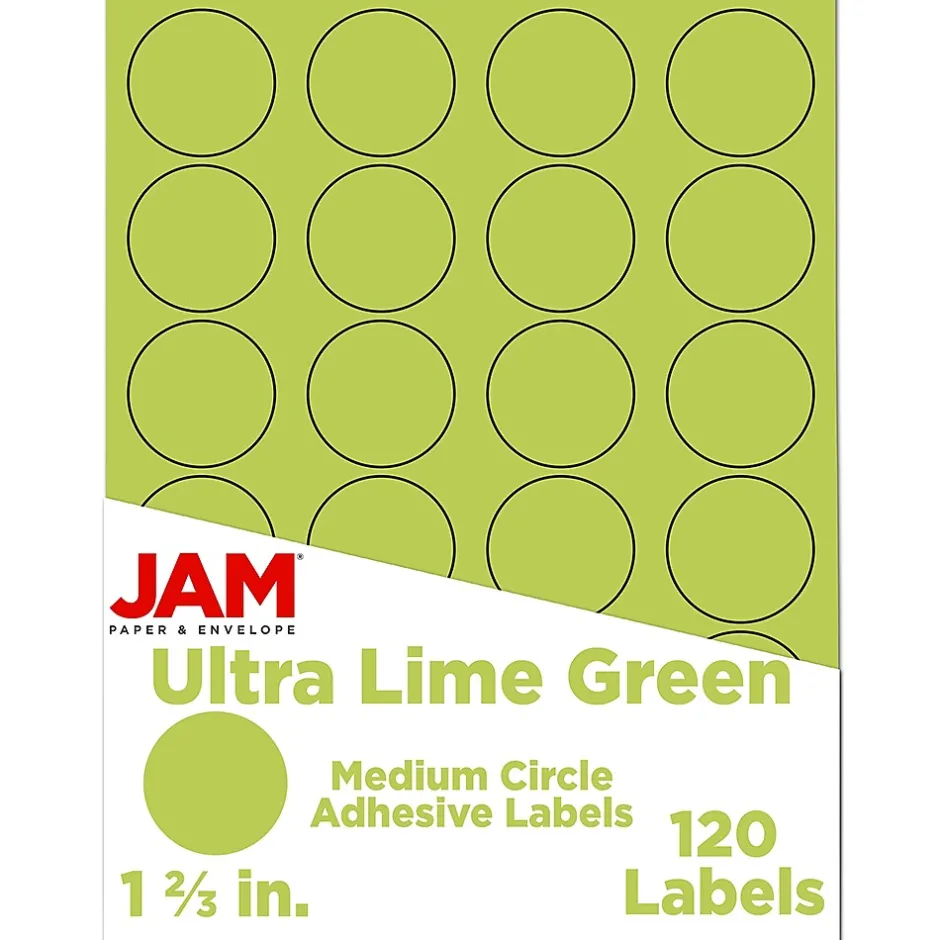JamĀ® 1 1/2″ Circle label sticker seals in lime green color is designed easily peel and stick for convenient usage. Label is printer friendly and compatible with templates in Microsoft Word, sold as 120 labels.