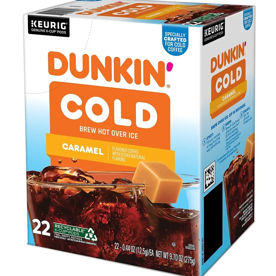 Dunkin’ Cold coffee is specially roasted for cold coffee that stands up to ice. Blended with sweet Caramel flavor, this pod gives you a bold, smooth taste that’s packed with the Dunkin’ flavor you crave. Simply brew it hot over ice, sip back, and relax with your deliciously smooth Dunkin’ Cold coffee at home. To prepare, simply fill a tumbler or mug about 0.75 of the way full with ice, and brew a K-Cup pod directly over it with your Keurig coffee maker (glass not recommended when pouring hot coffee directly over ice). Stir for at least 10 seconds and enjoy. Easy, convenient, and most importantly, delicious.