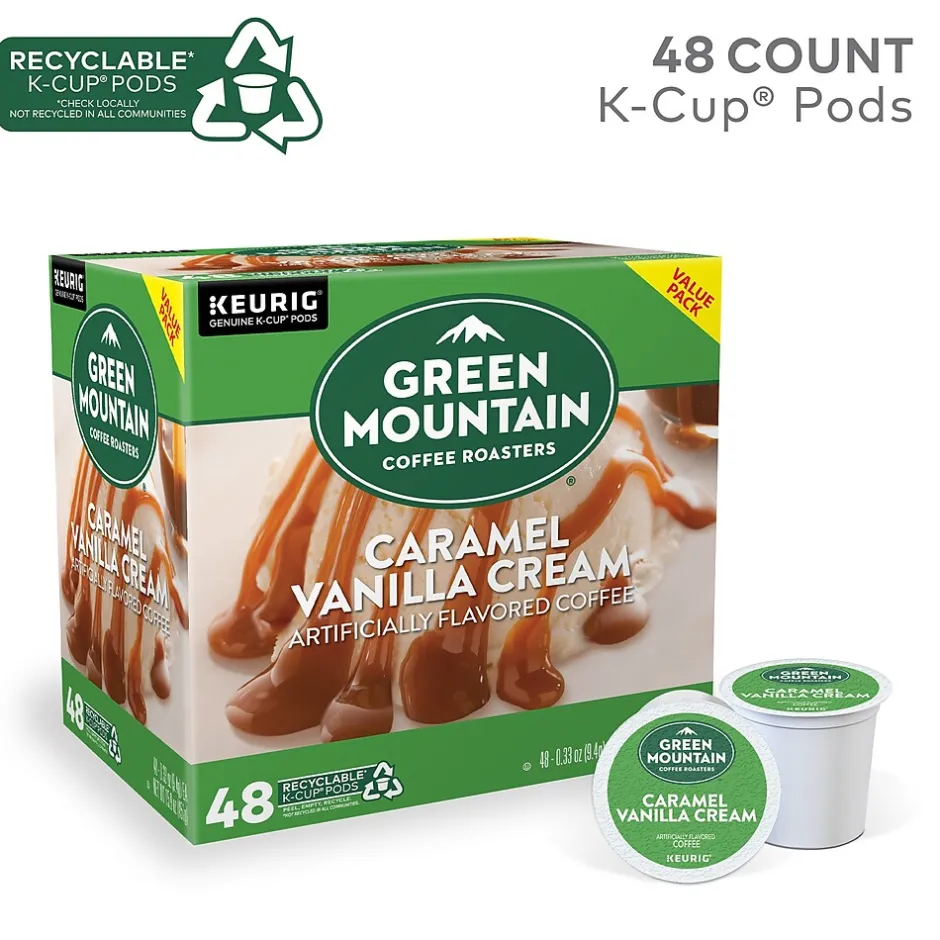 Experience the sweetness of these Caramel Vanilla Cream coffee pods. Each one features a delightful blend of toasted brown sugar and buttery caramel, while the subtle hints of creamy vanilla flavor provide a great taste and aroma. These Keurig K-Cup Green Mountain Coffee Caramel Vanilla Cream coffee pods have 48 in a pack, so stocking up is quick and easy.