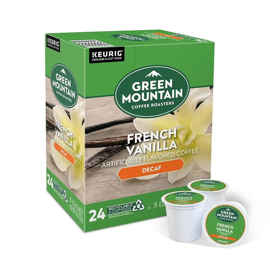 Make an exotic, sweet cup with these French Vanilla coffee pods. Each one is decaffeinated, so keeping your caffeine intake in check is easy, while the rich French vanilla flavor offers something to look forward to every day. These Keurig K-Cup Green Mountain Coffee Roasters coffee pods have 24 in a pack, so you can quickly stock up your supply at home or work.