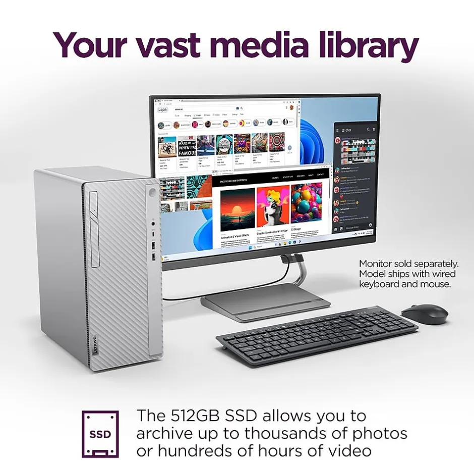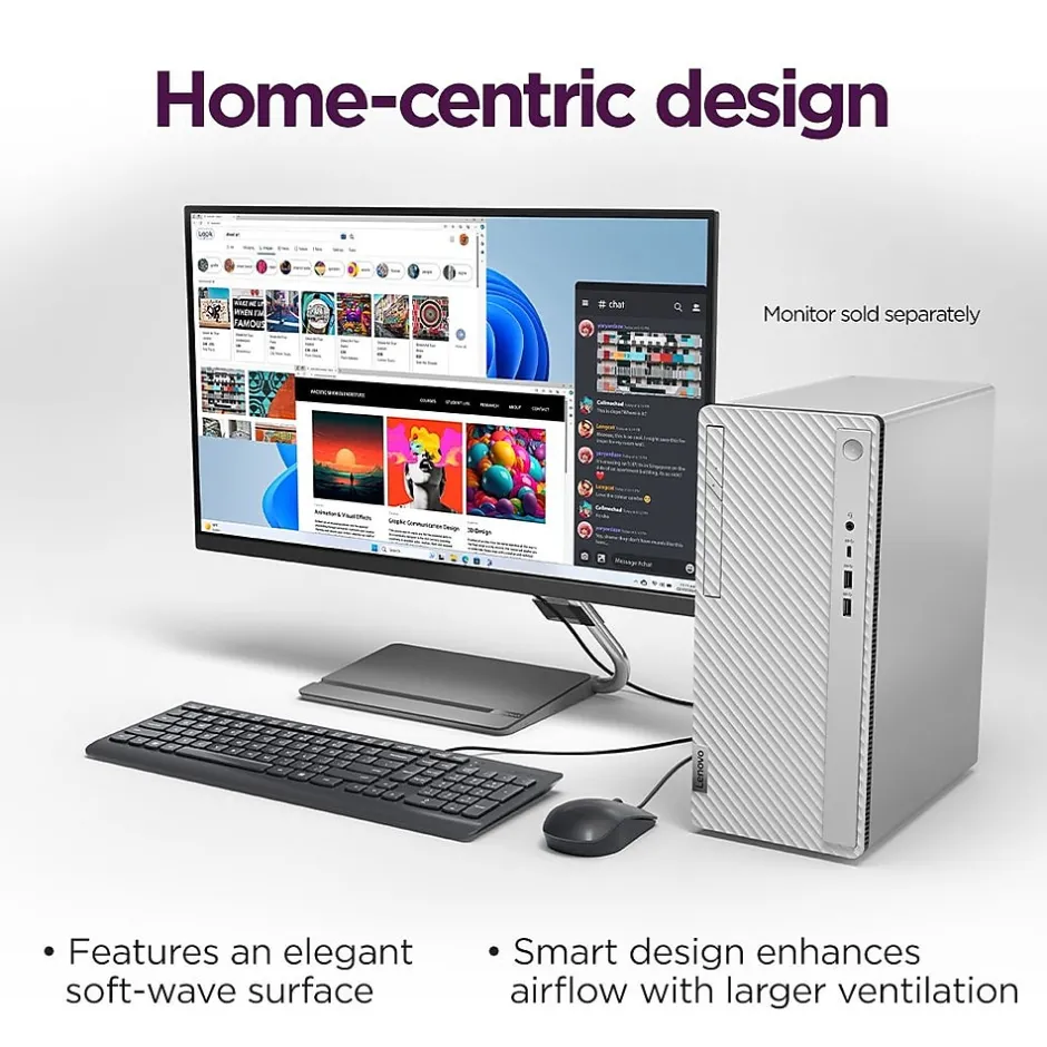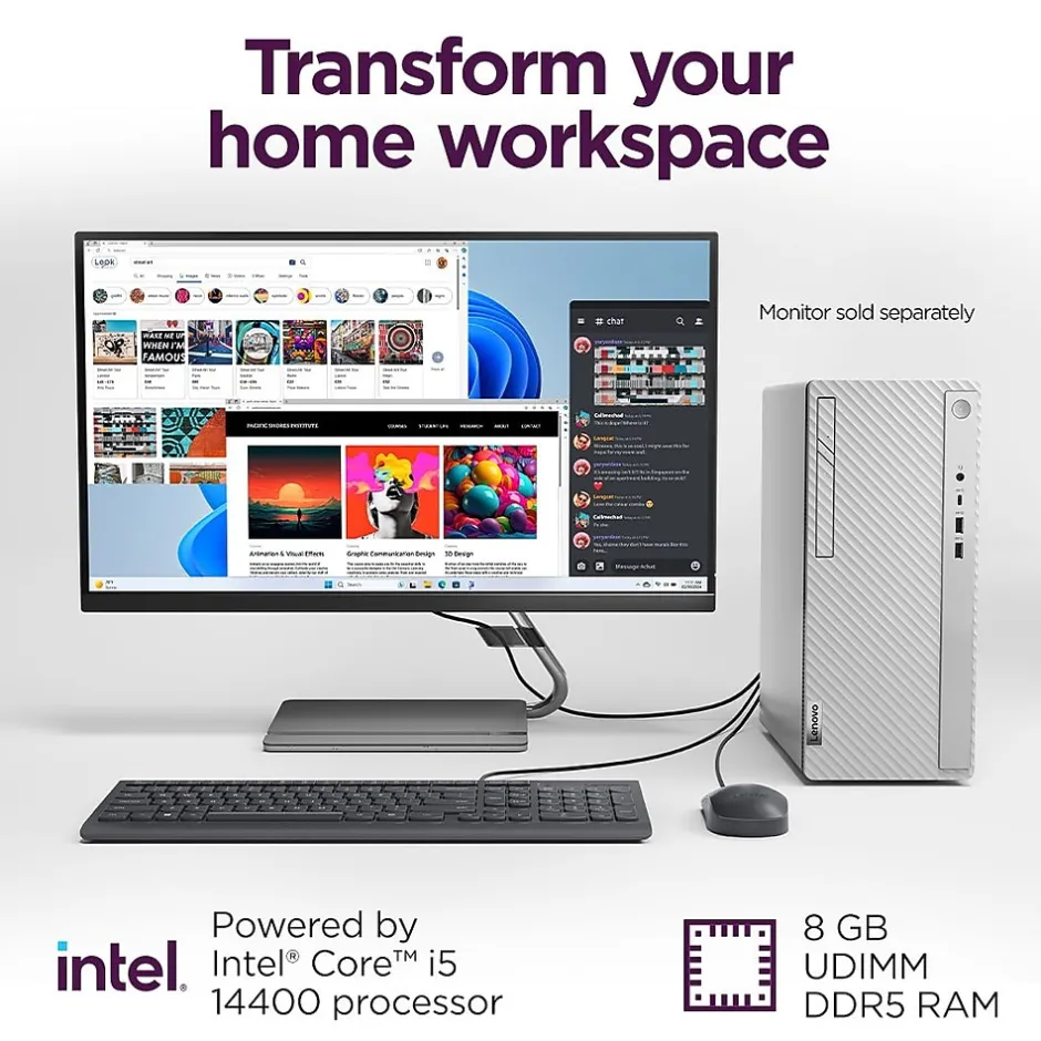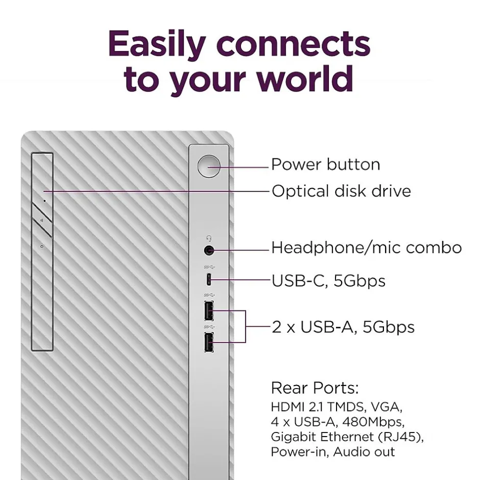 A perfect complement to your contemporary decor, the Lenovo IdeaCentre Tower desktop computer is a powerhouse driven by cutting-edge Intel Core i5 processor (14th Gen) and Intel UHD Graphics 730, keeping you productive and efficient from your own home. This desktop PC offers ample storage space while boasting enhanced connectivity options and ample ports to let you work, play, and create seamlessly.