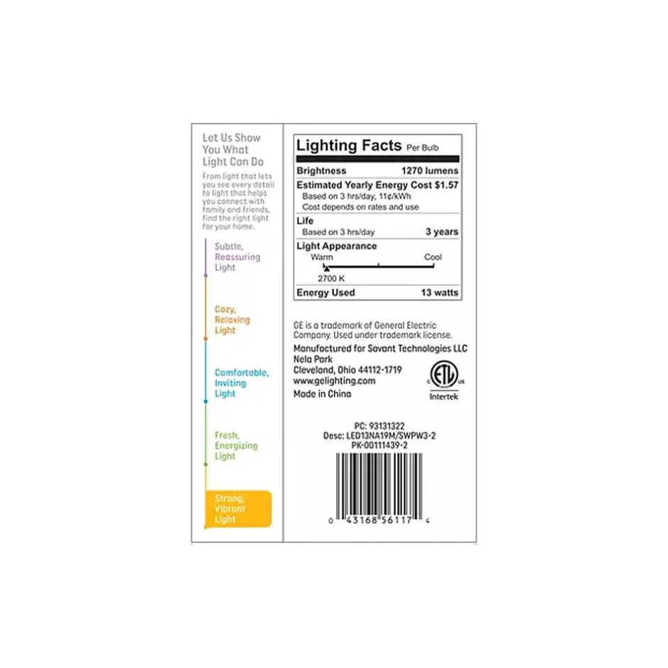 The GE Basic LED light bulb offers outstanding energy efficiency, long-lasting performance, and just-right brightness, all in one package. The bulb illuminates your home with warm, soft white light. Unlike CFL bulbs, this LED bulb features instant full brightness and is free of mercury. Great for frequently used fixtures: the LED’s long life and low energy use will help you save money on energy.