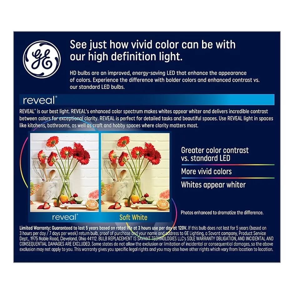 GE provides the optimal smart home experience, including exciting advances in intelligent lighting designed to enhance lifestyle and wellness in any setting. This GE Reveal HD+ light bulb is an excellent replacement for traditional incandescent bulbs. Reveal HD+ illuminates your home with clean, beautiful light that is perfect for kitchens, bathrooms, as well as craft and hobby spaces where clarity matters most.