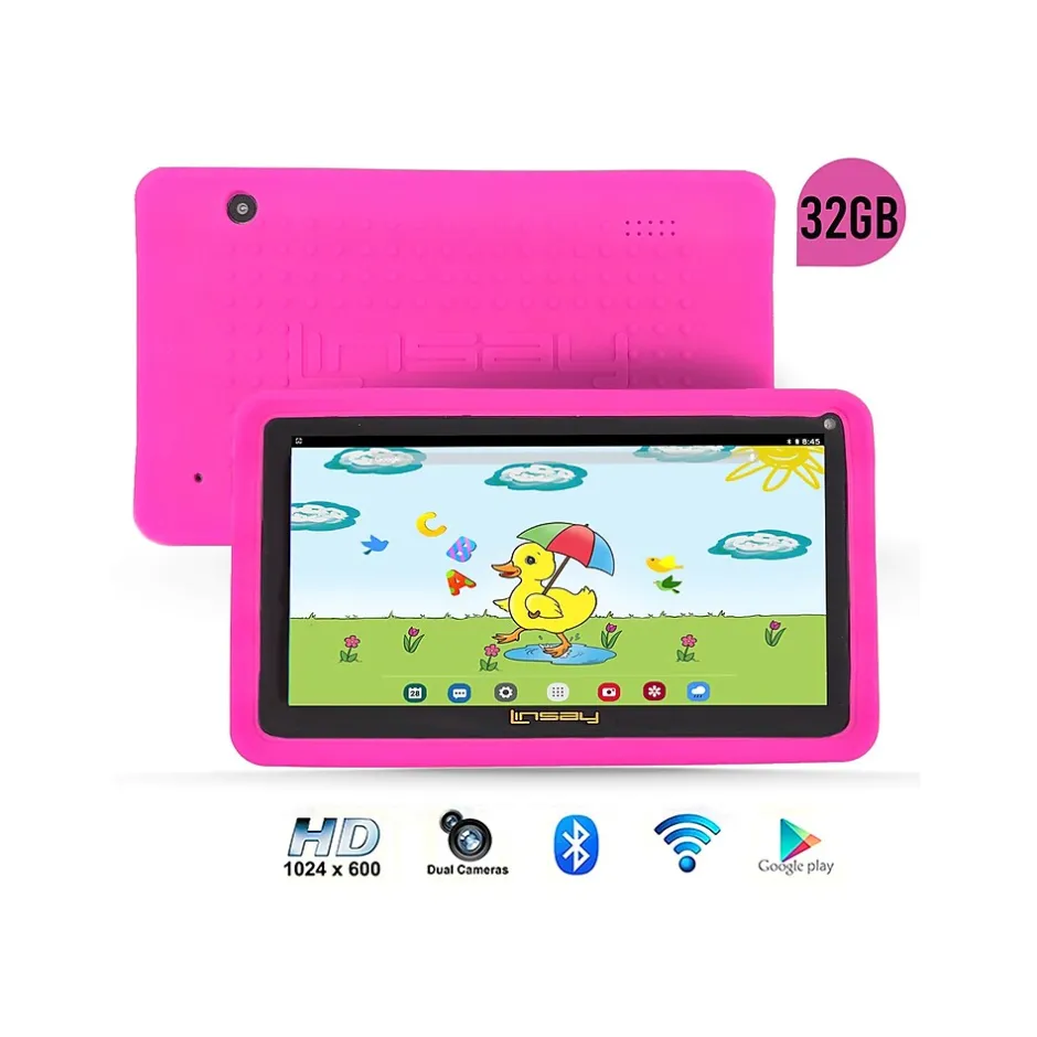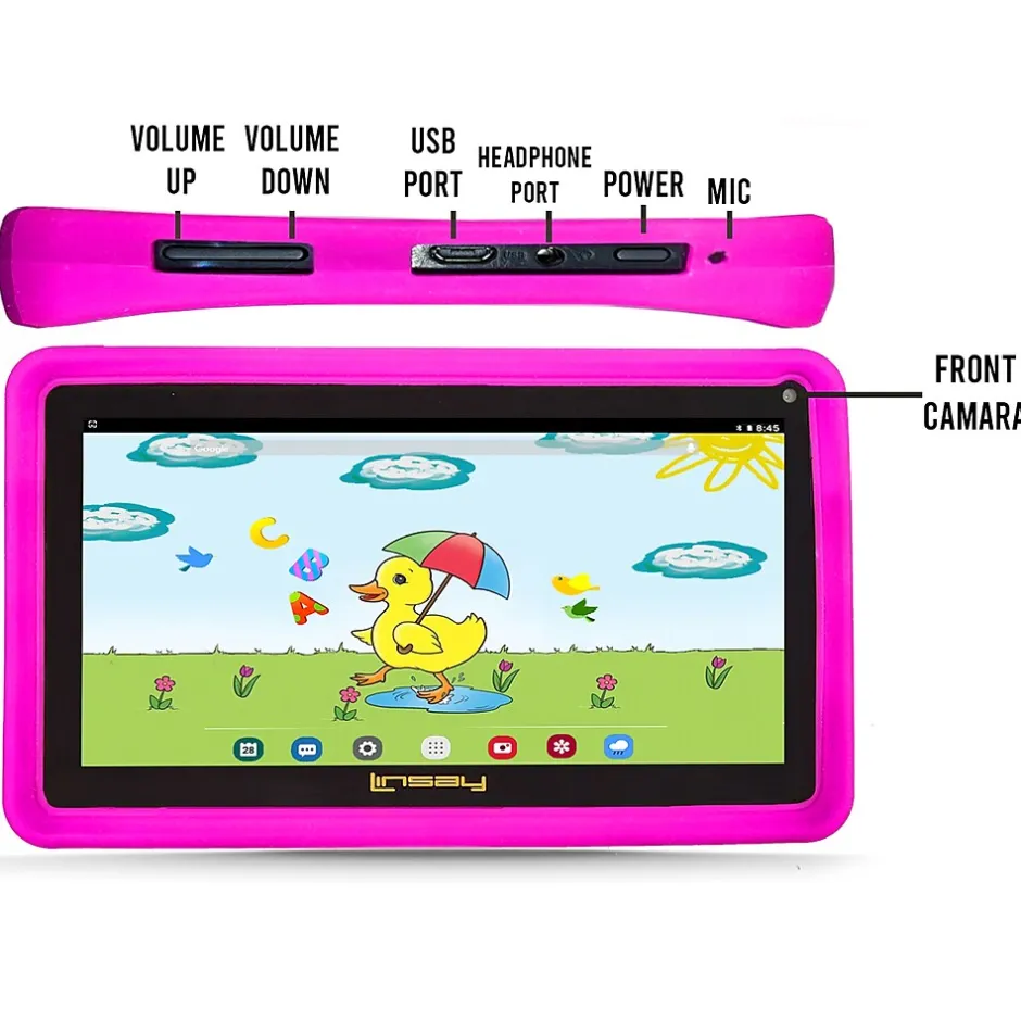 Let your kid and yourself learn and play with interactive apps designed for easy learning and entertainment, surf the Internet, play games, and watch your favorite movies with the Linsay high-definition screen 1024 x 600 tablet with Android 13 OS. A lightning-fast quad-core processor allows you to play your favorite games how they are meant to be played. Take high-quality pictures of your friends with the front and rear cameras. Android 10 OS is the latest version of the Android platform for phones, tablets, and more. It’s built on the things people love most about Android: easy multitasking, rich notifications, customizable home screens, resizable widgets, learning apps, videos, e-books, radio, and weather forecast, among many others. It has the deep interactivity that adds powerful ways of communicating and sharing. On this bundle is also included a 64GB microSD card, a fashion bag, and the 7″ Linsay pink kids’ smart protective case which helps you keep your tablet brand-new and undamaged.