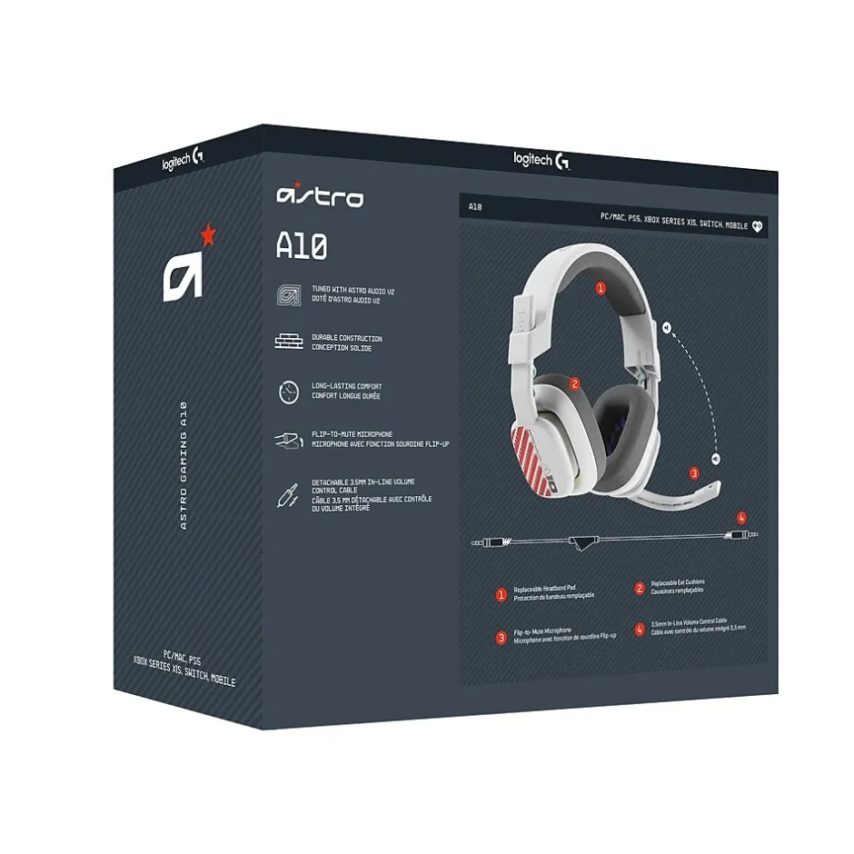Enhance your everyday gaming setup with the ASTRO A10 Headset. Experience explosive audio thanks to 32mm dynamic drivers, flip-to-mute boom mic, and durable construction with replaceable ear cushions and headband pad that combine for an unforgettable audio experience. Buckle down for all-night gaming sessions thanks to its ergonomic construction with closed-back design, supported with sturdy construction, and an ultra-durable headband that may just outlast your old favorite headset. Adjust your audio without leaving your seat with an inline volume control. ASTRO Gaming A10 Gen 2 Headset for Xbox features custom-tuned 32mm dynamic drivers so you can always hear your game and teammates with clarity and precision. Integrated boom microphone that can be flipped up to mute for privacy and down for crystal-clear comms via a 6.0 mm unidirectional mic. This Xbox gaming headset features a removable headphone cable with in-line volume control, letting you adjust audio without pausing the game. An ultra-durable headband and sturdy construction offers reliable performance that transcends the standard gaming headset for Xbox. Ergonomical and robust circumaural construction with a closed back design; optimal for long sessions. Replaceable ear cushions and headband pad removes the need to purchase a new headset, simply replace worn cushions and pads as needed.