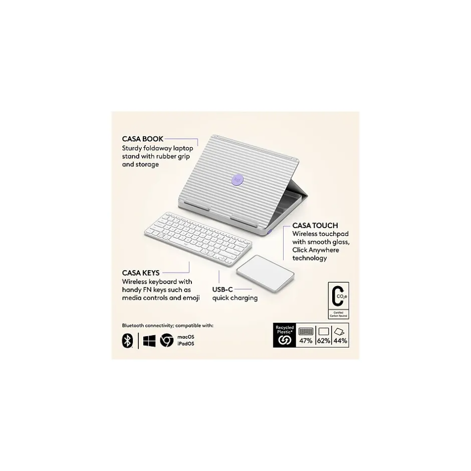- YOUR WORK ESSENTIALS IN ONE COMPACT KIT: Logitech Casa has all you need to work from home in one compact kit, with a wireless keyboard, wireless touchpad, storage space for smaller items such as stationery and a book-like case that transforms into a laptop stand.