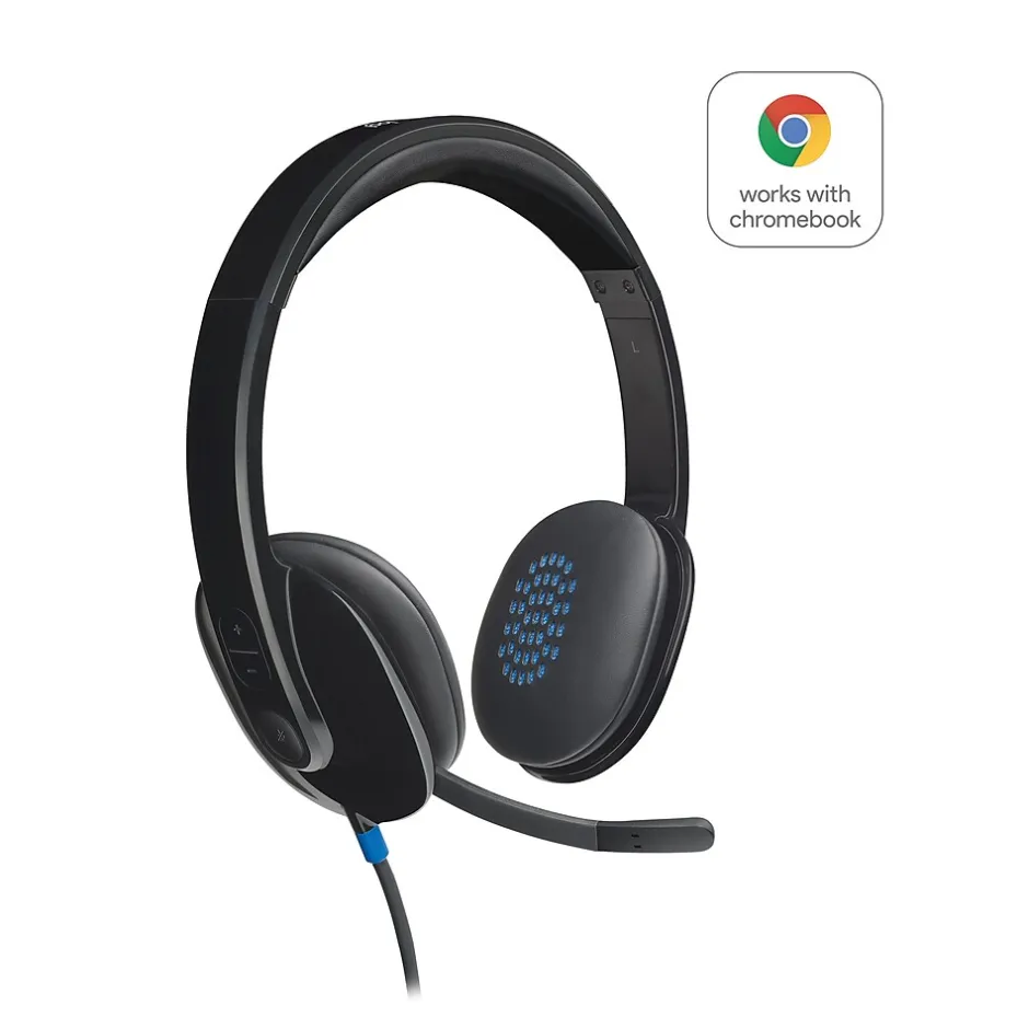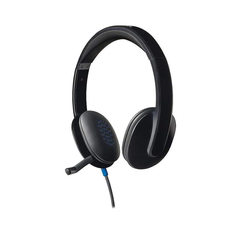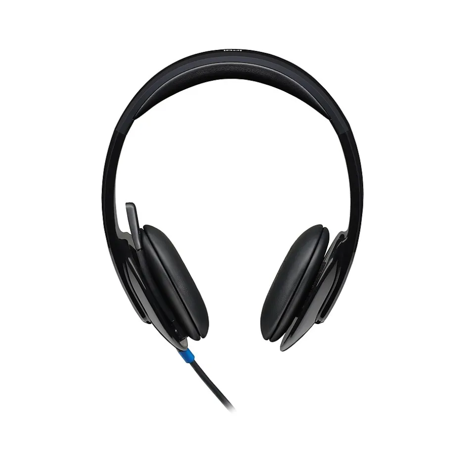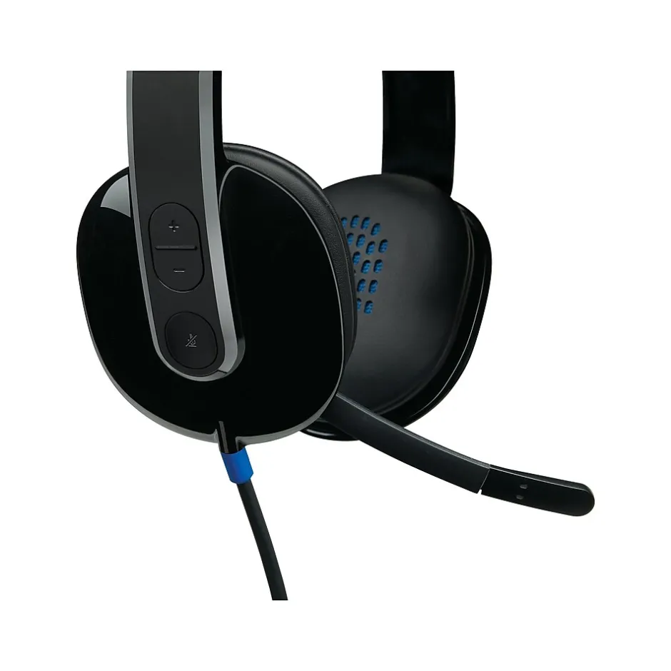 Keep computer-based calls and musical selections private with this headset. Leatherette ear pads and a padded headband keep you comfortable, and the integrated USB cable simplifies setup. This Logitech headset has a rotating noise-reducing microphone to reduce background sound during calls.