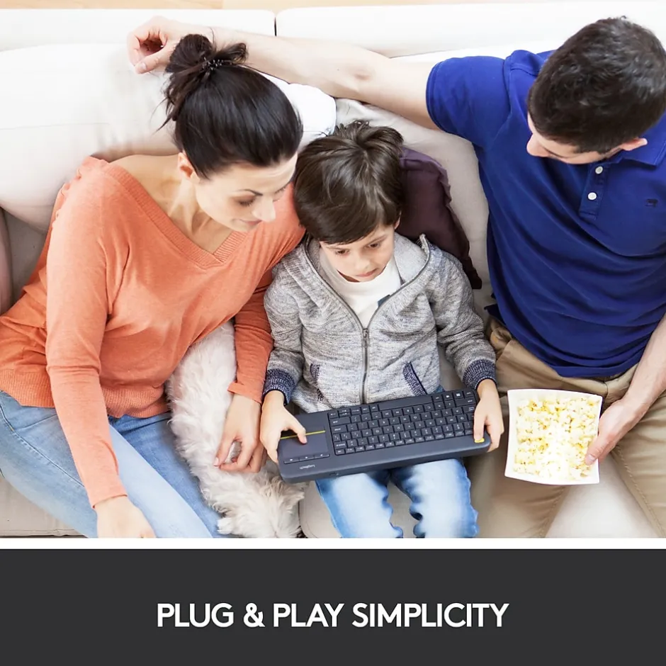 The Logitech® Wireless Touch Keyboard K400 Plus lets you experience PC-to-TV entertainment the way you Watch video, browse the web, chat with friends and much more. The all-in-one keyboard with touchpad ends the hassle—and clutter—of multiple devices. And a 10-meter (33-foot)¹ wireless range ensures your fun won’t be interrupted. Comfortable, quiet keys and a large (3.5-inch) touchpad make navigating entertainment effortless. Even setup is a snap thanks to the tiny, plug-and-play Unifying receiver. The 18-month² battery life means you might even forget the keyboard needs batteries. 1 Wireless range may vary depending on operating environment and computer setup. ² Assumes up to two hours typing per day. Actual battery life will vary with use, settings and environmental conditions.