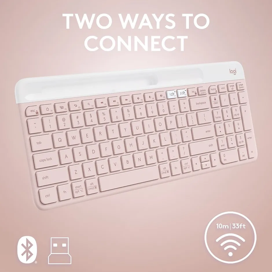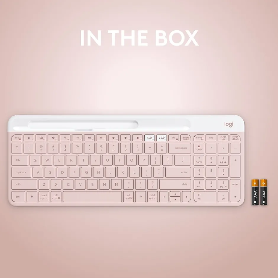 Own your space with the K585 Slim Multi-Device – an ultra-thin and design-forward keyboard perfect for simultaneously typing your ideas on your laptop and a text on your smartphone. Type across computers, tablets, and smartphones from one keyboard for one seamless workflow — with a built-in phone cradle for easier multitasking. The compact design integrates a number pad and media shortcuts, so you can work efficiently and comfortably in tight spaces. The quiet low-profile keys offer fluid, laptop-like typing, while an auto-sleep feature reserves battery life, so you can power through your work.