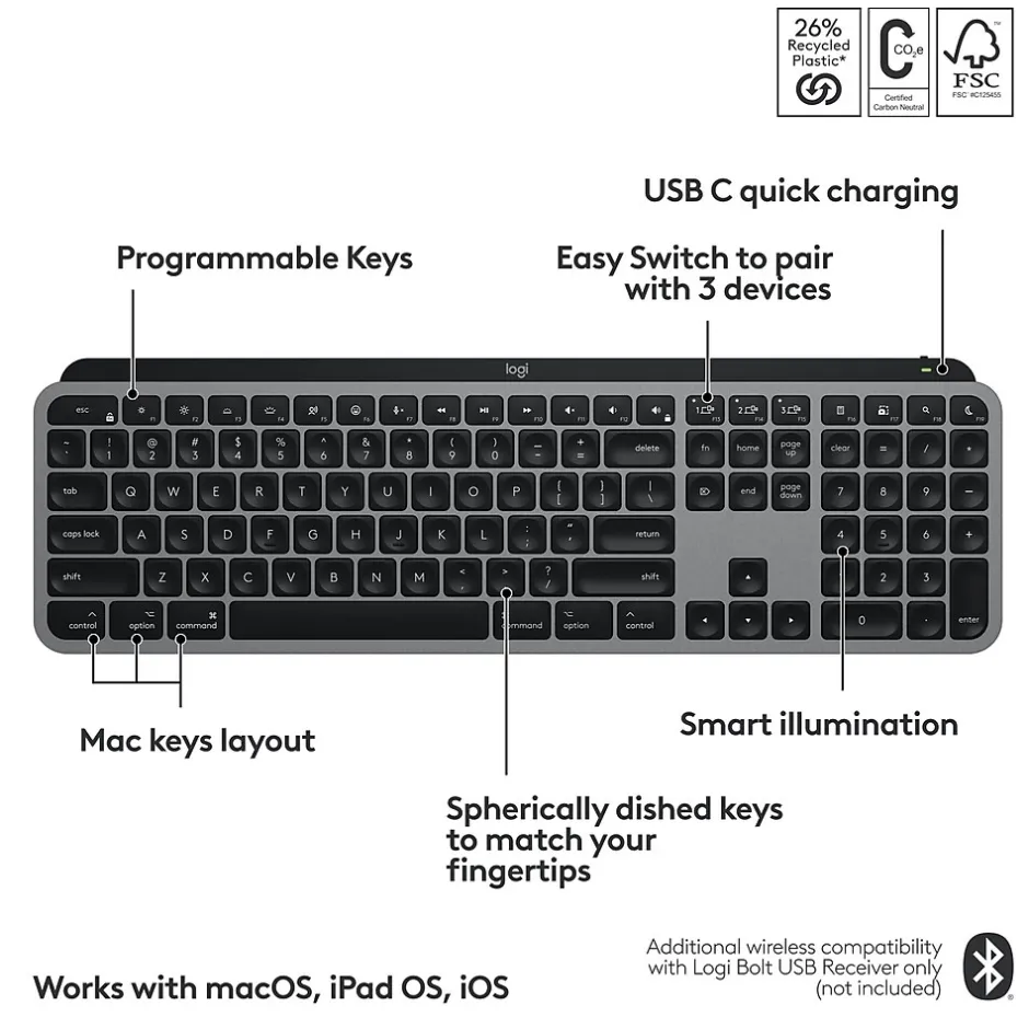 - Made With Recycled Plastic: Plastic parts in Logitech MX Keys S for Mac include certified post-consumer recycled plastic 26% for Space Gray and 11% for Pale Grey (5)