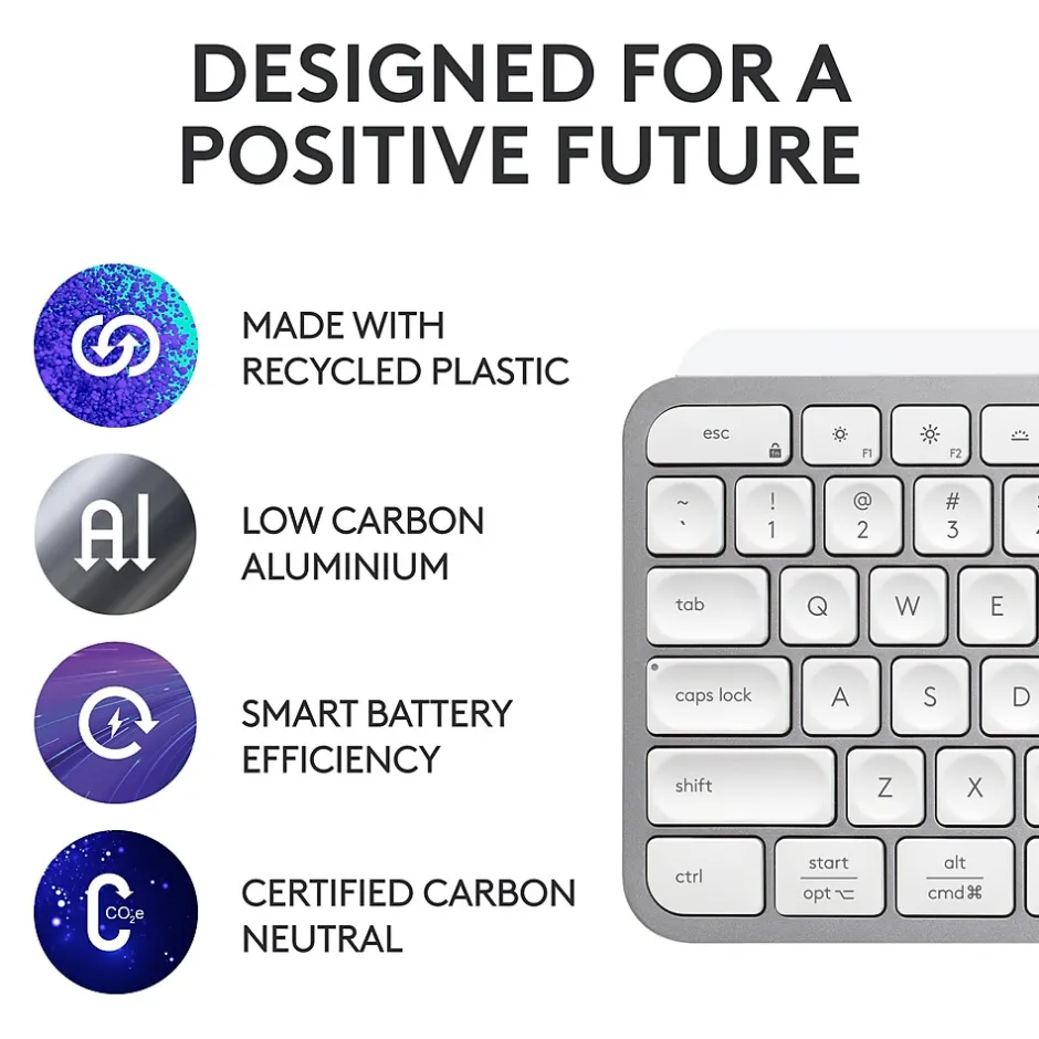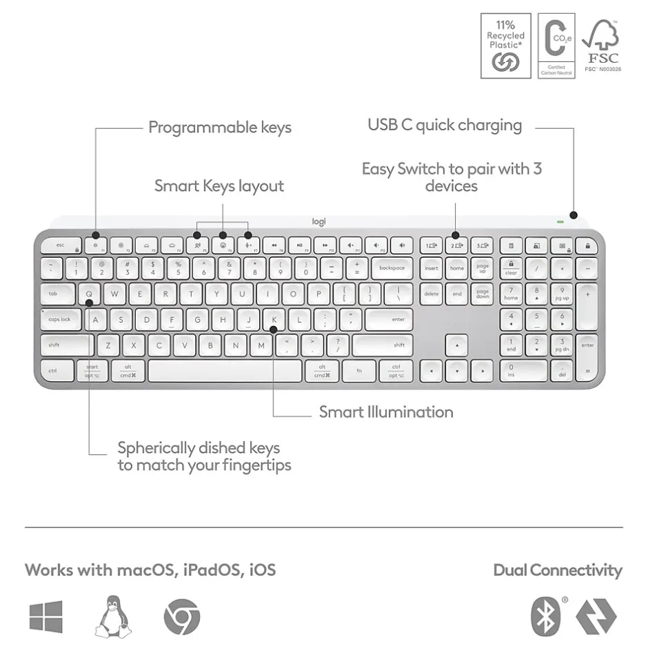 - Backlit keyboard keys light up and adapt to the environment as your hands approach it; now with more lighting customizations available via Logi Options+ app