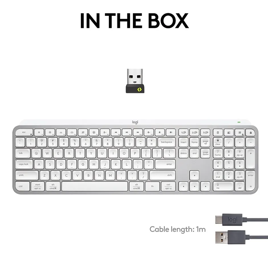 - Package contents: keyboard, Logi Bolt USB receiver, USB Type-C charging cable (USB Type-A to USB Type-C), user documentation