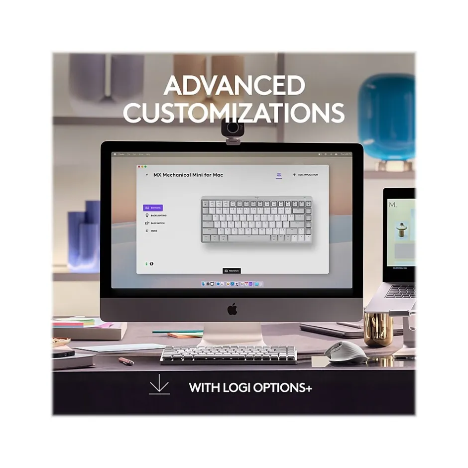 Introducing the MX mechanical mini for Mac, a minimalist keyboard mastered for Mac with a dual-color key layout for Mac computers to help improve precision through your peripheral vision. The MX mechanical mini for Mac is crafted for ergonomic comfort with tactile, quiet low-profile mechanical switches that allow you to create in a natural position longer, and battery-saving smart backlighting that keeps your creativity going. Connect instantly with up to three devices via Bluetooth Low Energy, and switch between them with a push of a button. Charge while you work with USB Type-C to USB Type-C quick charging.