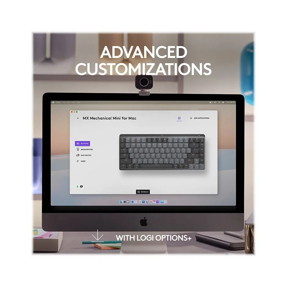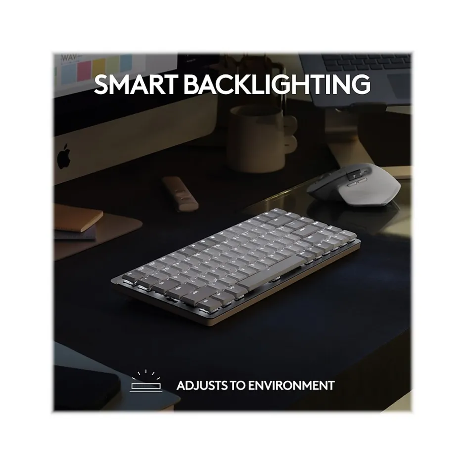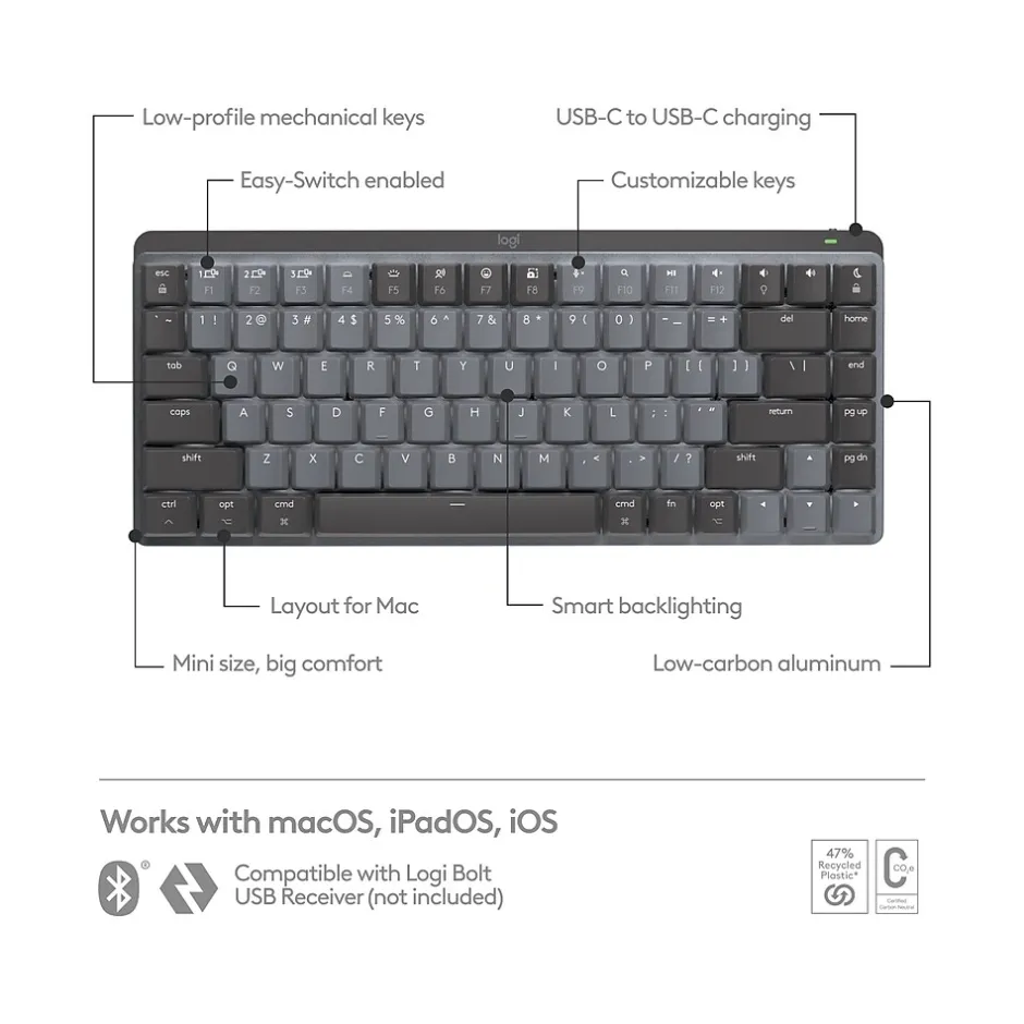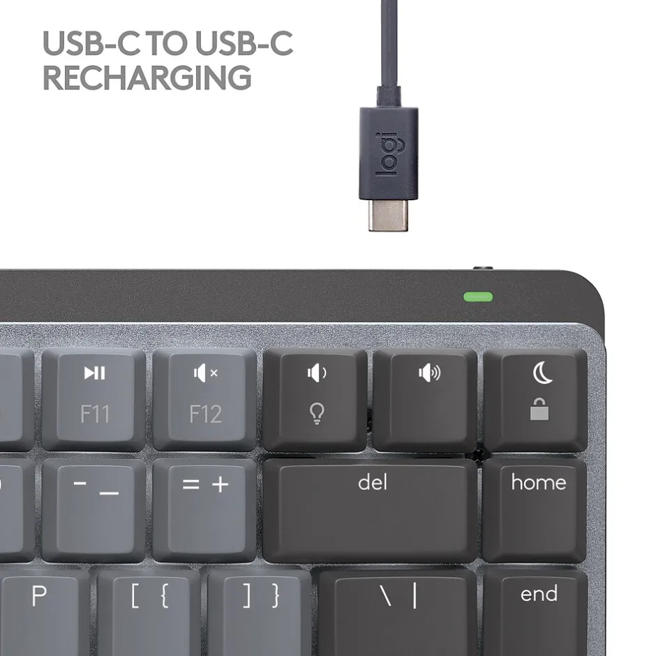 Introducing the MX mechanical mini for Mac, a minimalist keyboard mastered for Mac with a dual-color key layout for Mac computers to help improve precision through your peripheral vision. The MX mechanical mini for Mac is crafted for ergonomic comfort with tactile, quiet low-profile mechanical switches that allow you to create in a natural position longer, and battery-saving smart backlighting that keeps your creativity going. Connect instantly with up to three devices via Bluetooth Low Energy, and switch between them with a push of a button. Charge while you work with USB Type-C to USB Type-C quick charging.