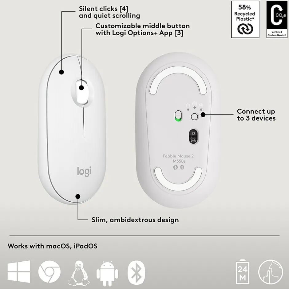 Logitech Pebble 2 slim, multi-device Bluetooth keyboard and mouse with customizable keys and button.