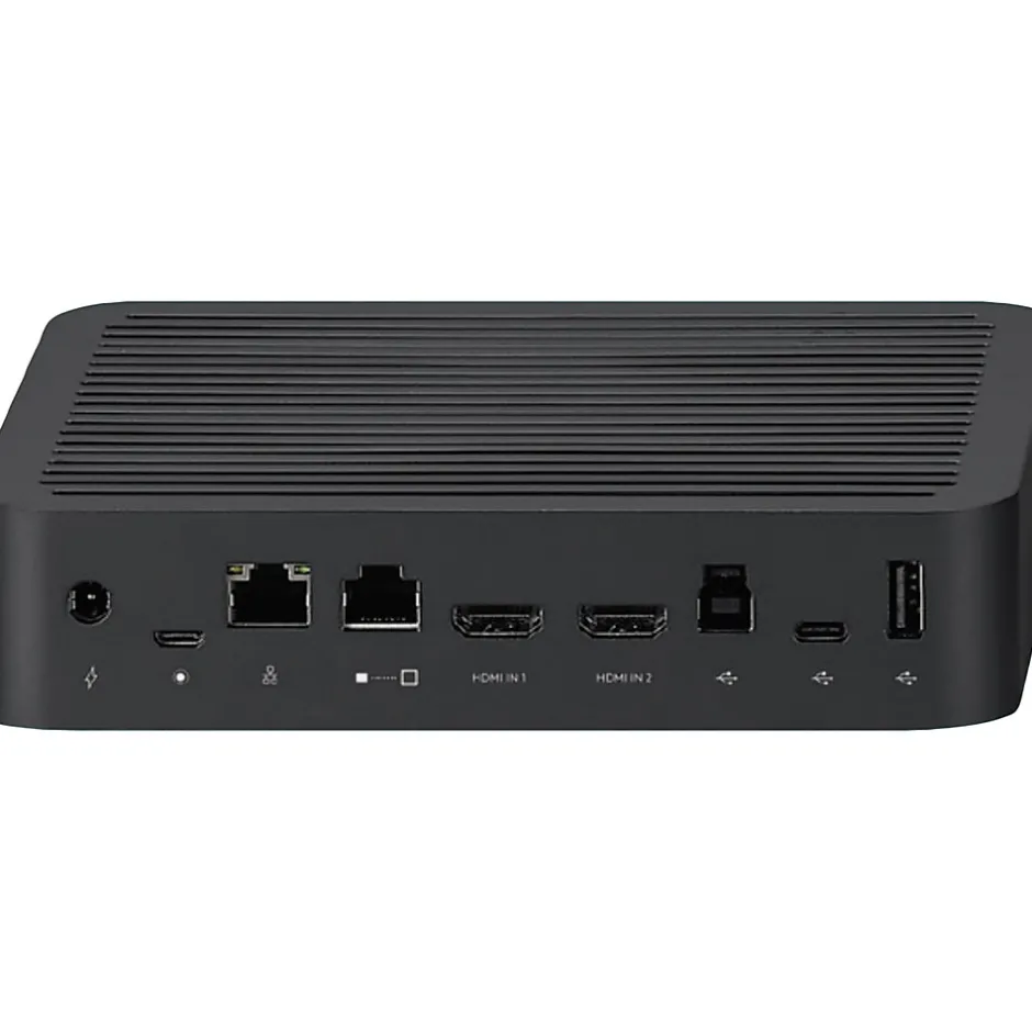 - Features 2 x HDMI Type A (connects to displays), 1 x USB C (connects to Rally camera), 1 x USB Type B (connects to meeting room computer), 1 x USB Type A (reserved for future capability), 2 x RJ45 (Ethernet), and 1 x 12 Pin connector for Rally Mic Pod