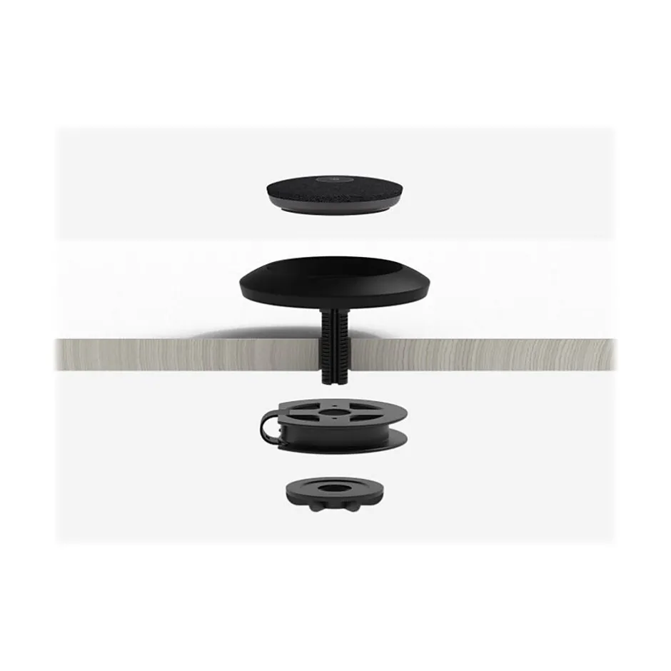 Say goodbye to visible cables and wandering mic pods. With a compact footprint and clever design details, the Logitech mic pod mount anchors Logitech Rally mic pods in place, provides a hidden path for cabling, and coils excess cable beneath the table. Mic pod mount gives meeting room tables a finished look while keeping connections secure, meeting after meeting. Use existing grommet holes or drill a new hole for preferred placement. A convenient cable spool eliminates excess cabling below the table.