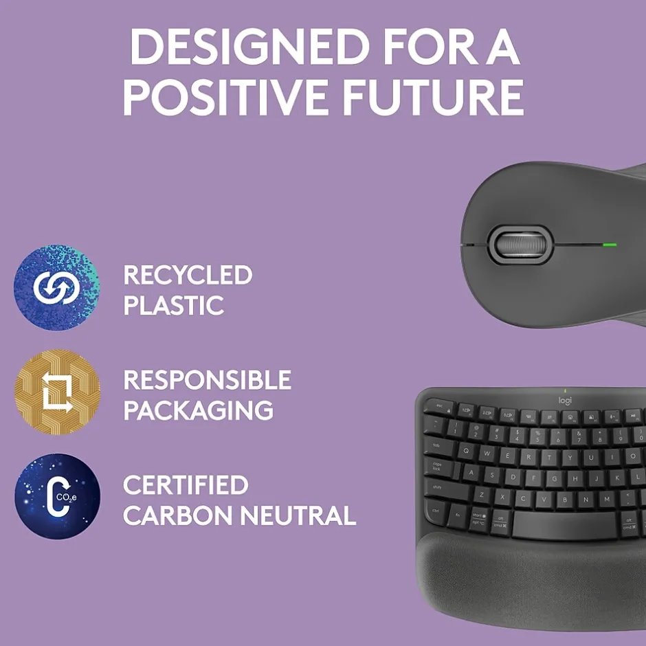 Discover this Logitech feel-good wireless combo, with an intuitive ergonomic keyboard and mouse sculpted for day-long comfort and productivity. Typing feels instantly familiar on Wave Keys’ wavy key frame design. A cushioned palm rest lifts pressure and improves wrist support. Meanwhile, the Signature M550 L’s contoured shape and rubber side grip keep medium- to large-size hands comfy throughout the day. Both devices have been made with recycled plastic, have a long battery life, and connect easily using Bluetooth or the included Logi Bolt receiver.
