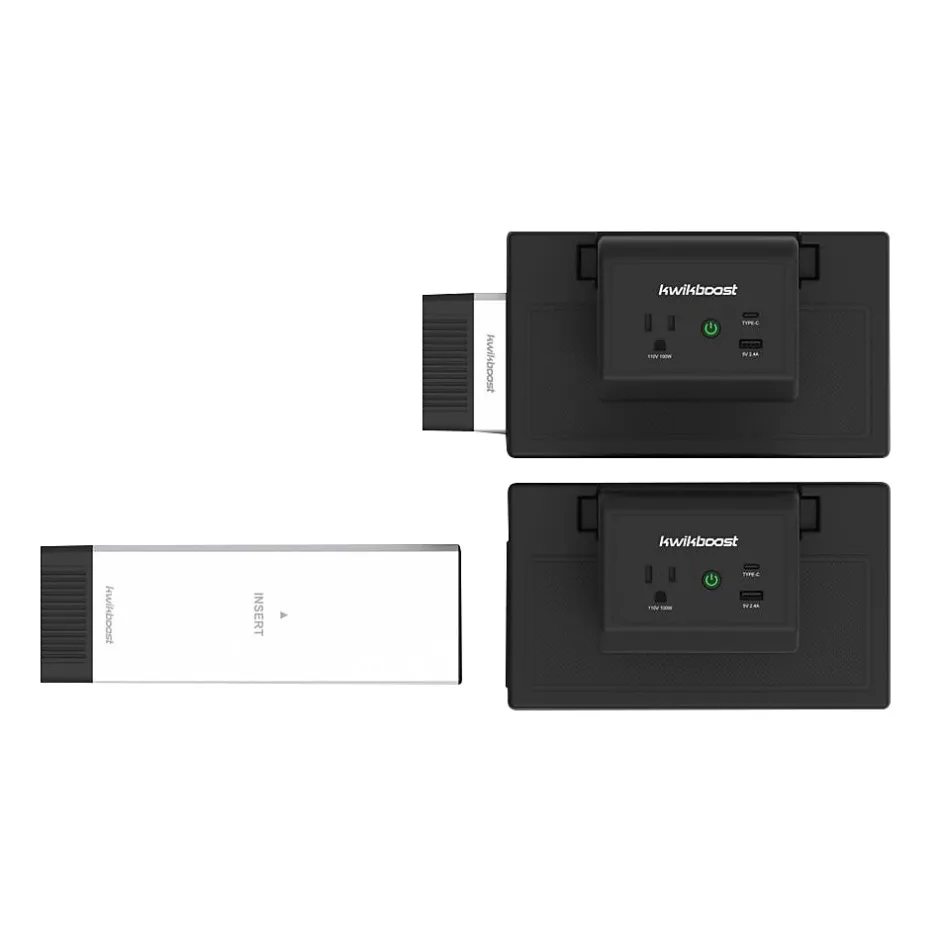 Enjoy the convenient cordless charging of mobile devices. The Luxor KwikBoost EdgePower desktop charging station system is a total solution for laptops and mobile devices in workspace and classroom environments. The system eliminates extension cords by putting power right where you need it. The KwikBoost EdgePower medium-use bundle includes six rechargeable batteries, six clamp-on desktop charging units, plus a three-bay base charging station. This system is perfect for medium-size rooms where users require frequent access to supplemental power. Each clamp-on desktop charging unit features an innovative design that easily attaches to most tables and desktops. Once connected, each unit offers a standard AC outlet, a USB Type-A charging port, and a USB Type-C PD charging port.