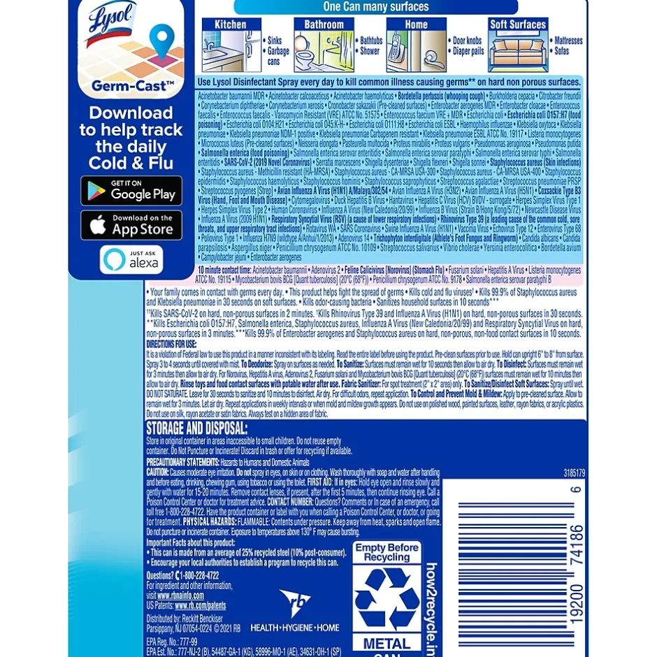 Lysol® kills 99.9% of viruses and bacteria, including the virus that causes COVID-19 and cold and flu viruses when used as directed. Help protect high-traffic areas and high-touch surfaces, including desks, bathrooms, doorknobs, and railings. Deliver hospital-type disinfection on to soft surfaces, including upholstery, curtains, sofas, mattresses, and cushions. Meet customer and staff expectations around disinfection. Simply spray and let air dry.