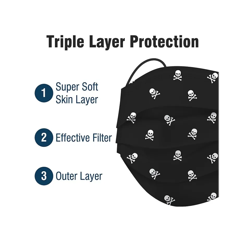 - Comes in black with a skull pattern and features an adjustable wire that runs along the top to serve as an adjustable nose clip