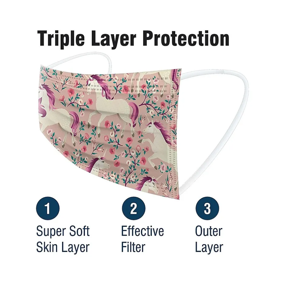 - Adjustable metal wire runs along the top as a nose clip; the masks come in assorted unicorn designs