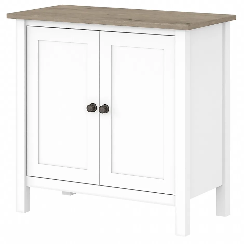 The Bush Furniture Mayfield accent storage cabinet with doors combines a casual look with a practical design that makes organizing household items easy. Maintain an organized work or living space with a floor cabinet that suits your casual home. Highlighted by its relaxed modern farmhouse style, the Bush Furniture Mayfield accent storage cabinet with doors is a perfect fit for virtually any residential setting. Closed storage with one adjustable shelf accommodates household items and supplies of various sizes. Doors open on smooth Euro-style hinges for easy access to materials you want to be kept in order but out of sight. Make use of the versatile 30″H x 31″W x 16″D design to organize your home office, living room, entryway, kitchen pantry, or bathroom. Upgrade your storage and display capacity with the coordinating Mayfield tall hutch organizer (sold separately) to add an open shelf area for books, pictures, and decorations. This two-door cabinet is tested to meet ANSI/SOHO standards for safety and performance and is backed by a 1-year warranty.