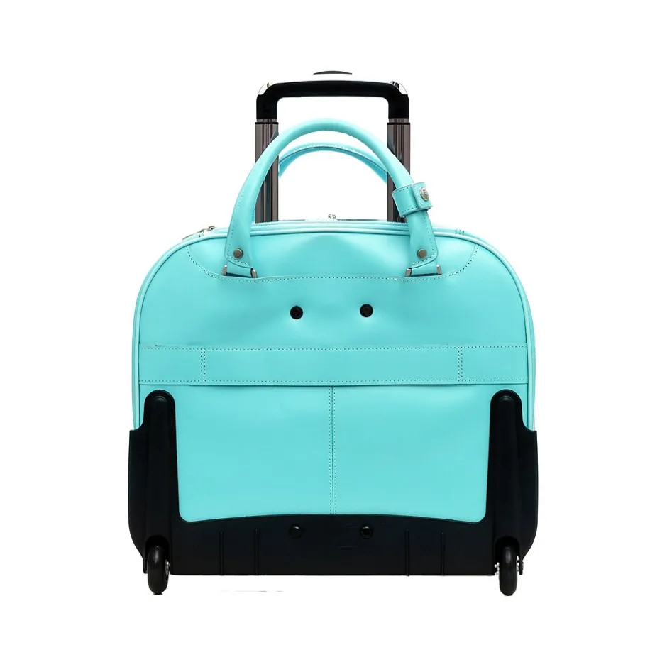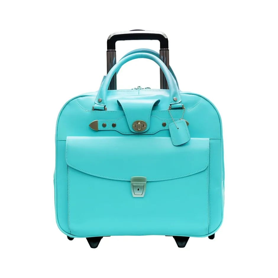 The McKlein DENALI wheeled briefcase features a quick-access front pocket secured by a key lock and containing an organizer for business cards, pens, and accessories. A small front pocket is secured by a flap with turn lock, while a built-in high-density laptop compartment protects laptops up to 15″ in size. The case also offers three slip pockets for power cords, media devices and accessories, and a double compartment divided by an accordion expandable file for important documents. A smart strap allows for easy transport on extended handles of other rolling cases and luggage.