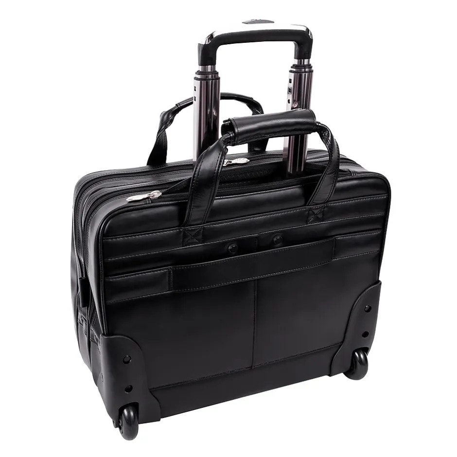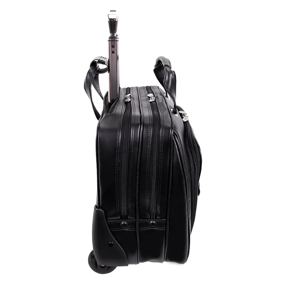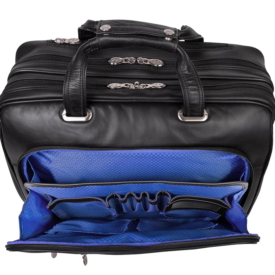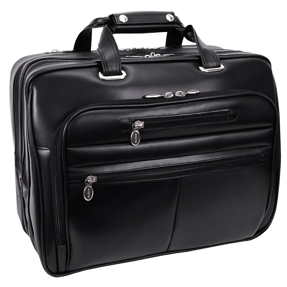 Briefcase with front zipper pockets provide storage space for small miscellaneous items.