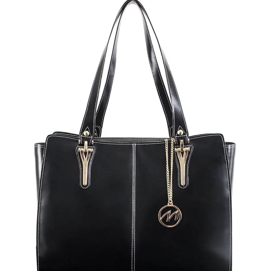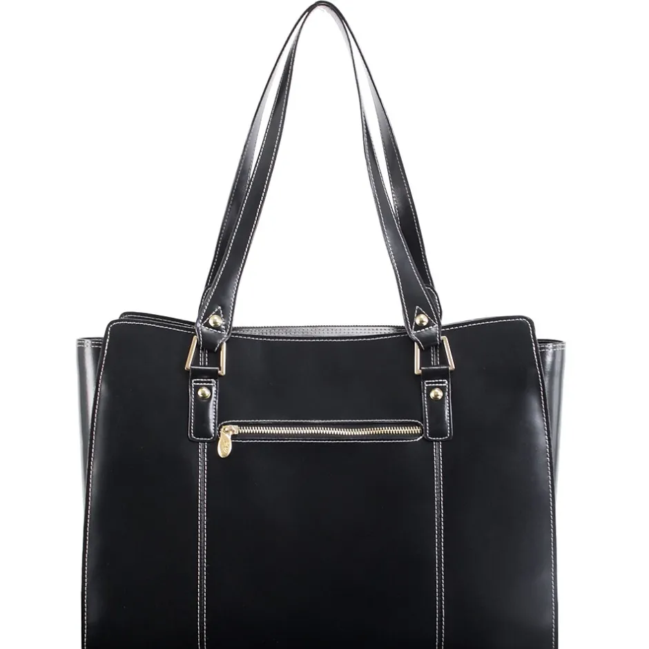- Tote features elegant Gold Key Chain. Easy Access Exterior back pocket. One pocket perfect for tablets. Secure zipper pocket. Two Leather reinforced accessory slip pockets.