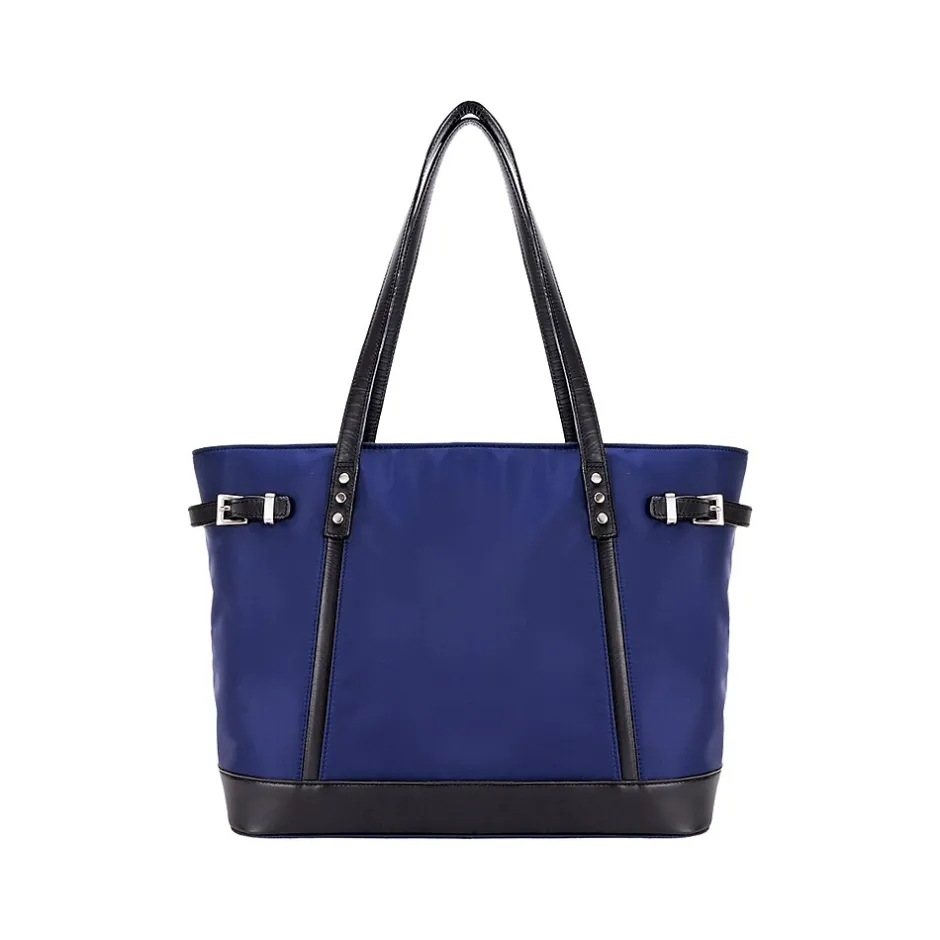 - Spacious navy nylon tote with a leather trim with silver accent hardware and metal zippers