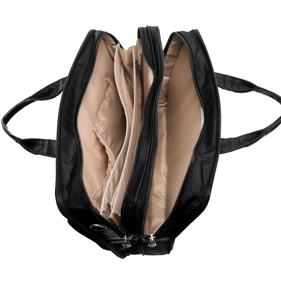 Nylon briefcase front organizer pocket for media devices, cell phone, business cards, key chain holder and pens. Front zipper pocket for small miscellaneous items. Front compartment with accordion file for all your document needs and two small pockets. Back compartment padded to protect most laptops up to 15″ in size. Smart Zipper feature allows easy attachment on extended handles of rolling cases and luggage.