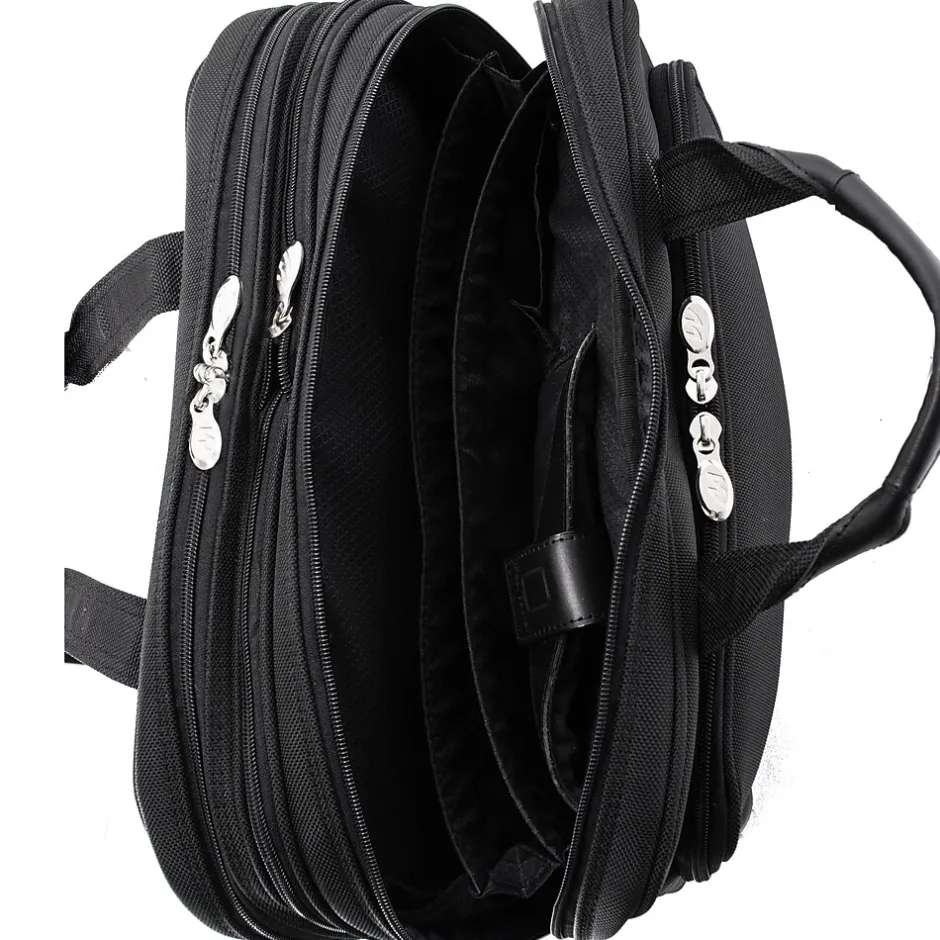 Nylon briefcase with front zipper pocket for small miscellaneous items. Front organizer with storage space for media devices, cell phone, business cards, key holder and pens. Front compartment features file divider for documents with an expandable feature to provide 3% more storage space. Back Compartment padded with high-density foam to protect most laptops up to 17″ in size. Smart Zipper Attachment allows easy attachment on extended handles of other rolling cases and luggage. Removable shoulder strap included.