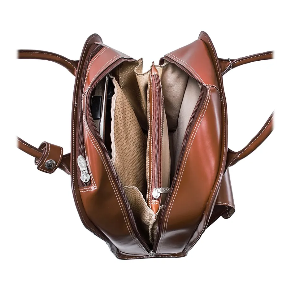 The UPTOWN by McKleinUSA is a wheeled ladies’ laptop briefcase made of leather. Its vertical design allows you to easily roll the case in tight spaces like airport aisles, trains, and buses. The quick-access front pocket secured by a flap features a key lock. The interior organizer has storage space for media devices, business cards, key holder and pens. The built-in high-density laptop compartment protects laptops up to 15″ in size. The smart attachment strap allows transport on extended handles of other rolling cases and luggage.