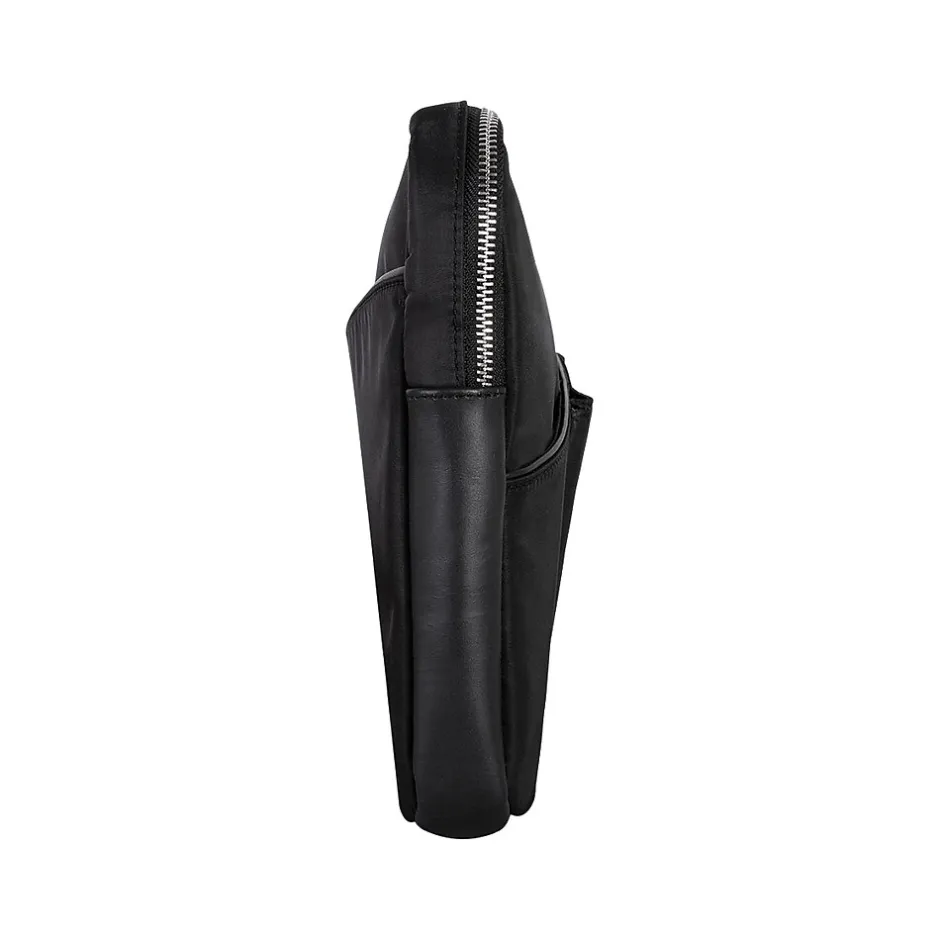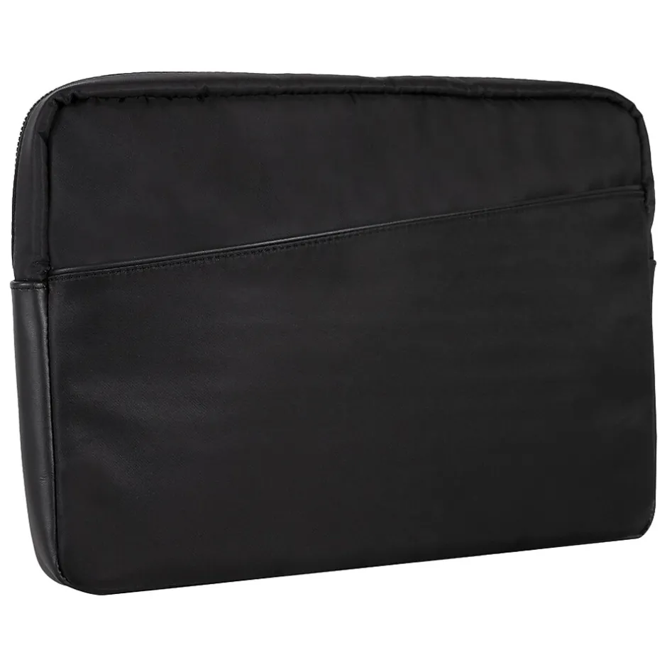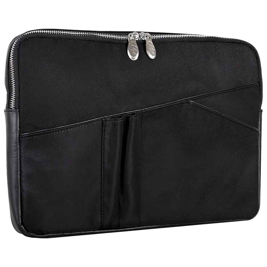N Series AUBURN 15″ padded laptop sleeve is made of trend-setting lightweight nylon with leather accents that provides easy transportation with proper functionality. Comes in black color. Features fully-lined interior, and two compartments: easy-access front organizer for pens and small accessories, and back full-length file pocket. Closure is represented with metal zippers and silver accent hardware.