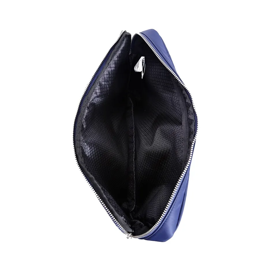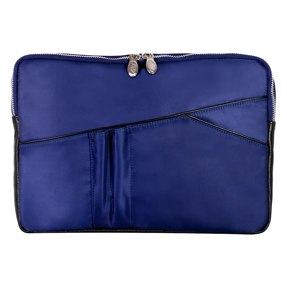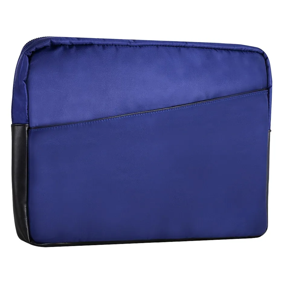 N Series CRESCENT 14″ padded laptop sleeve is made of trend-setting lightweight nylon with leather accents that provides easy transportation with proper functionality. Comes in navy color. Features fully-lined interior, and two compartments: easy-access front organizer for pens and small accessories, and back full-length file pocket. Closure is represented with metal zippers and silver accent hardware.