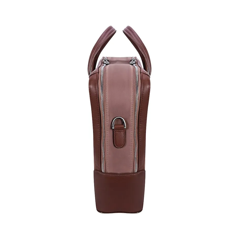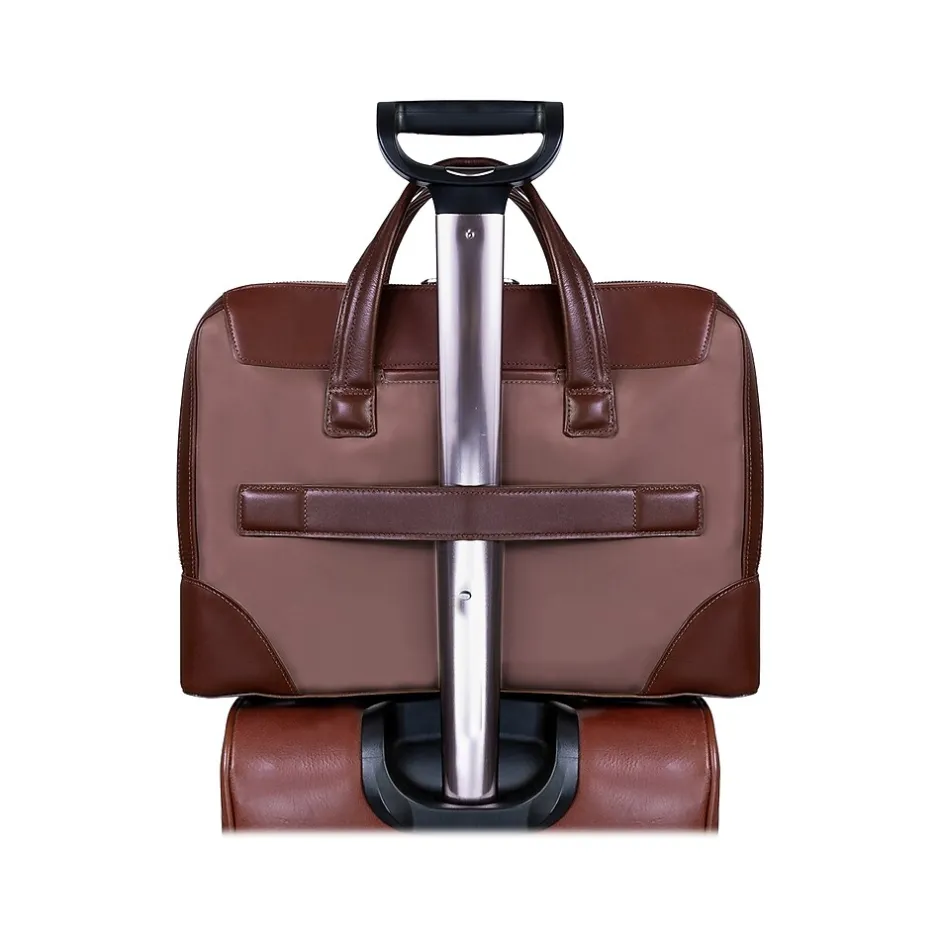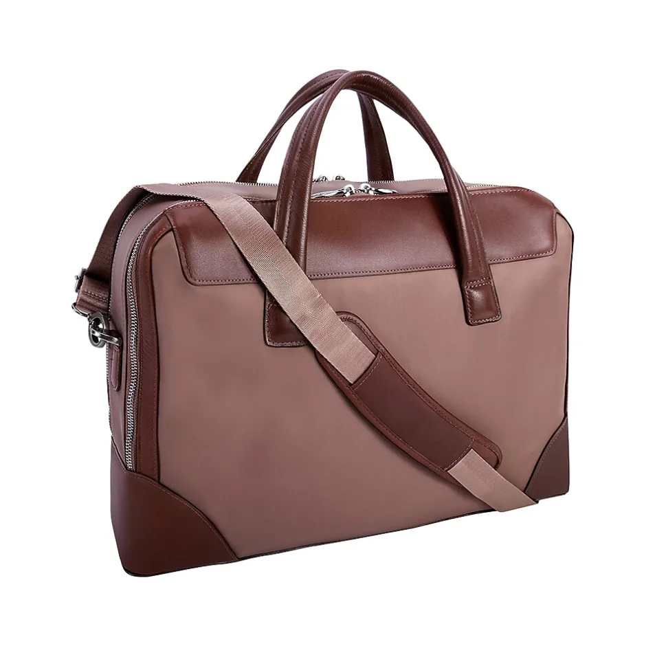 This structured nylon briefcase with a leather handle has a fully lined interior with leather accents. Its front compartment features dual tablet pockets with an organizer for business cards, pens, and accessories. The spacious back compartment features a padded laptop compartment.