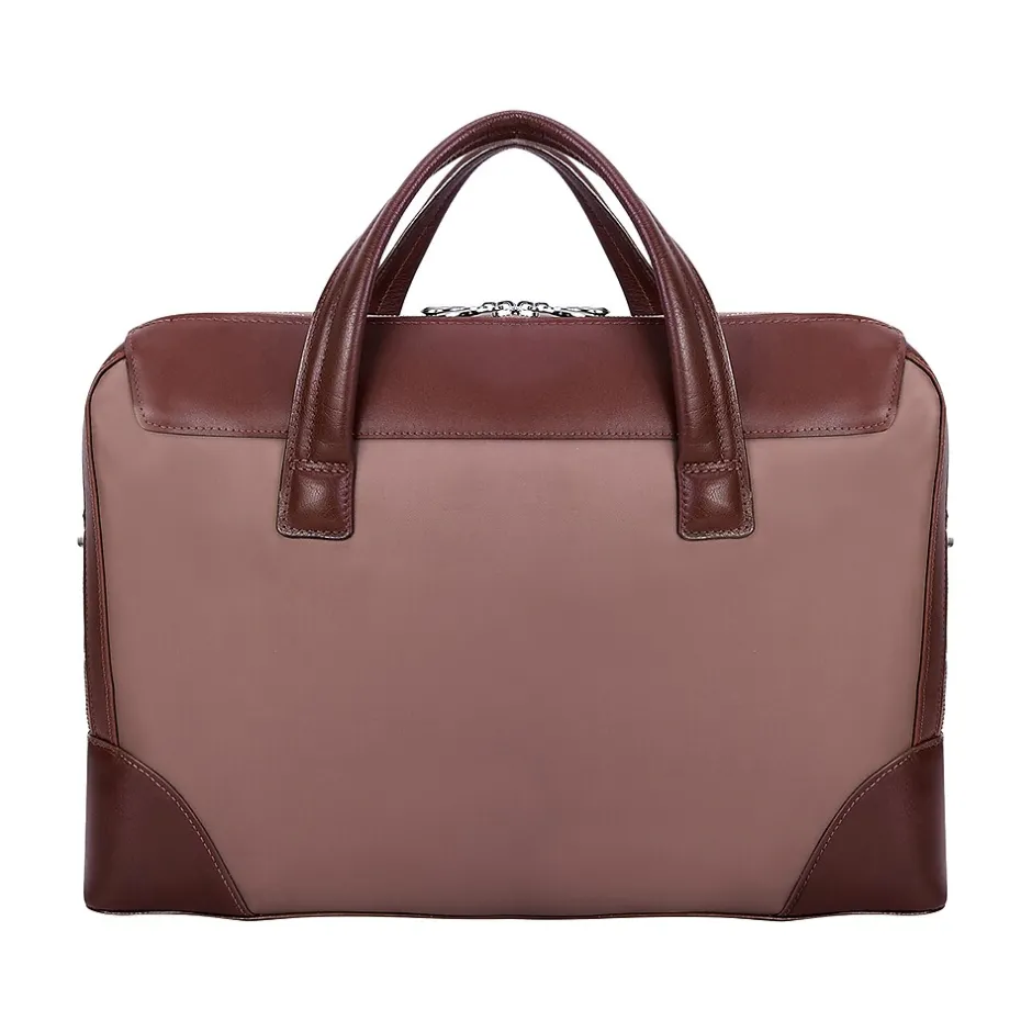 - Khaki-colored briefcase with brown inserts made of nano tech-light nylon with a leather trim