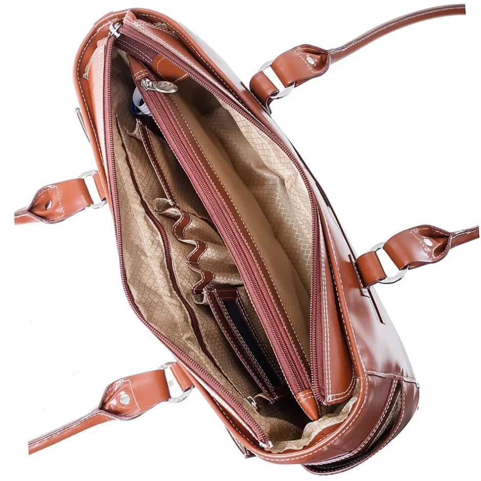 Briefcase offers front pocket with a magnetic snap holds small accessories. Two side pockets for small miscellaneous items. Back pocket for accessories. Includes Tablet Pocket. Main compartment features an interior zipper pocket and an interior organizer for pens, business cards and small devices. Built-in high-density compartment protects laptops up to 15″ in screen size. Leather shoulder straps.