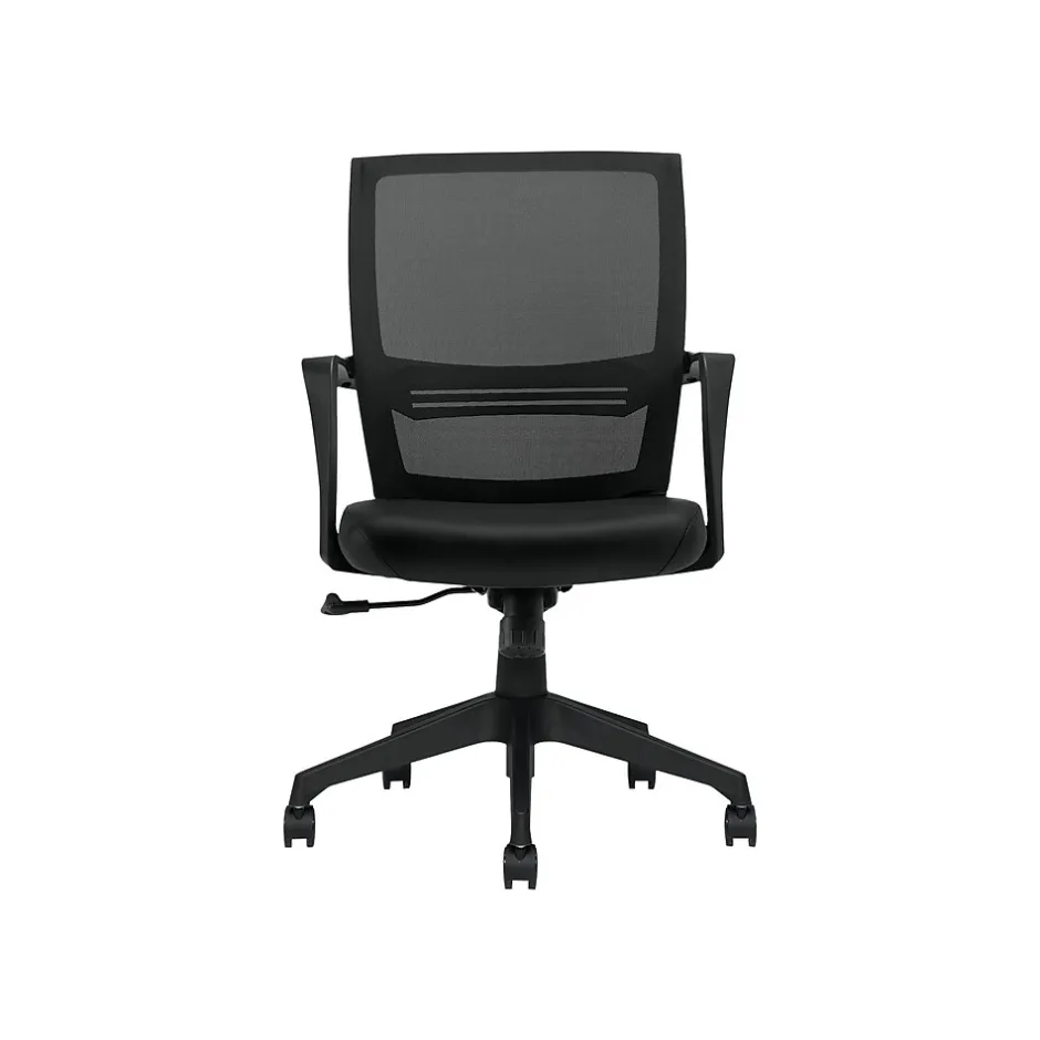 The Offices to go conference chair features a mesh back with Luxhide seat. The pneumatic seat provides height adjustment. Single-position tilt lock provides tilt tension adjustment.
