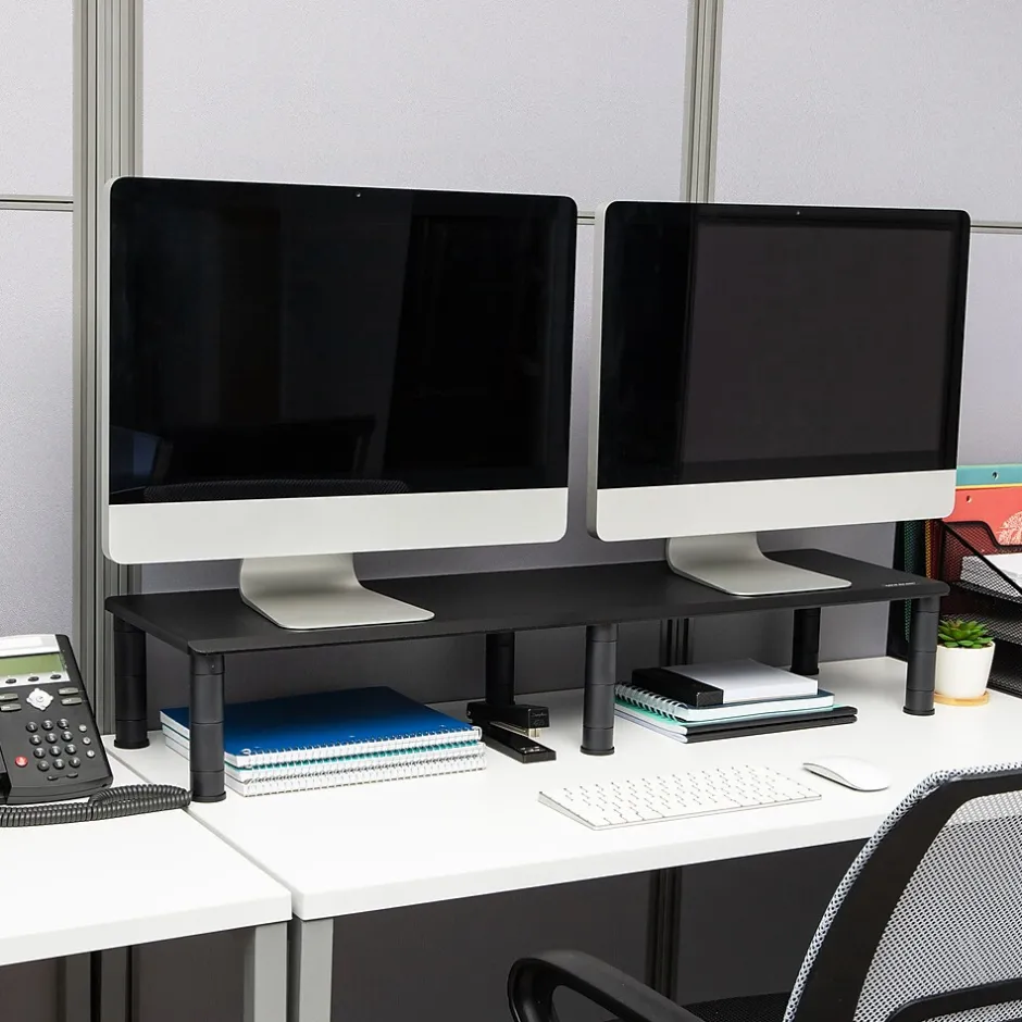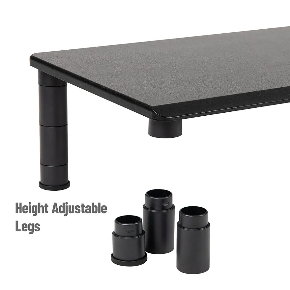 Enhance productivity and ergonomics with our dual monitor stand, a perfect solution for multi-screen users seeking an organized workspace. Utilize one side for electronics like laptops or printers, freeing up valuable desk space. Tailor the stand to your needs with four adjustable height settings for optimal comfort.Beneath the stand, stash office essentials like pens and notepads, maintaining a tidy workspace. Anti-slip rubber grips secure the stand and safeguard your desk from scratches. Holding up to 40 lbs. (18.1 kg), it’s durable and easy to clean with mild soap and water. Lightweight and portable, it’s suitable for home or office use, doubling as a shelf for TVs or home theater systems.Part of the Anchor Collection, our dual monitor stand combines style and functionality, making it an ideal gift for various occasions. Whether for a new office setup or a home office transformation, this stand promises to enhance any workspace.