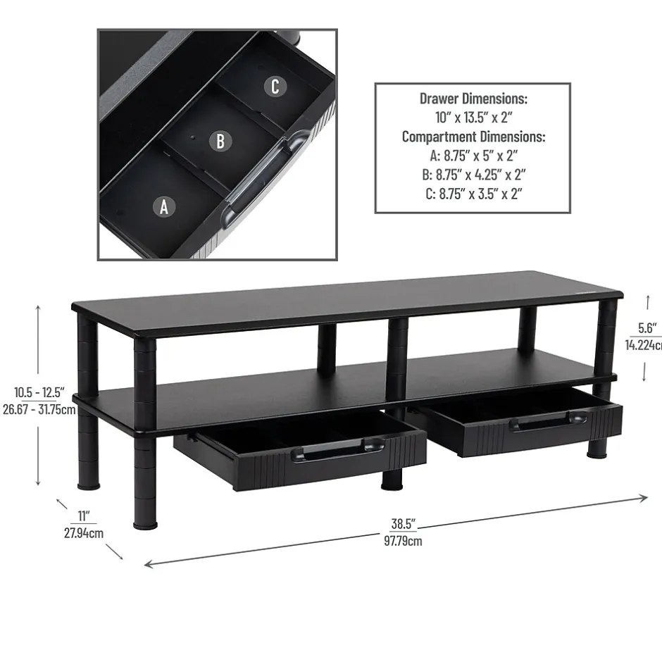 - Dimensions: The dual monitor risers measure 38.5 inches (97.79 cm) in length, 11 inches (27.94 cm) in width, and between 10.5 to 12.5 inches (26.67-31.75 cm) in height
