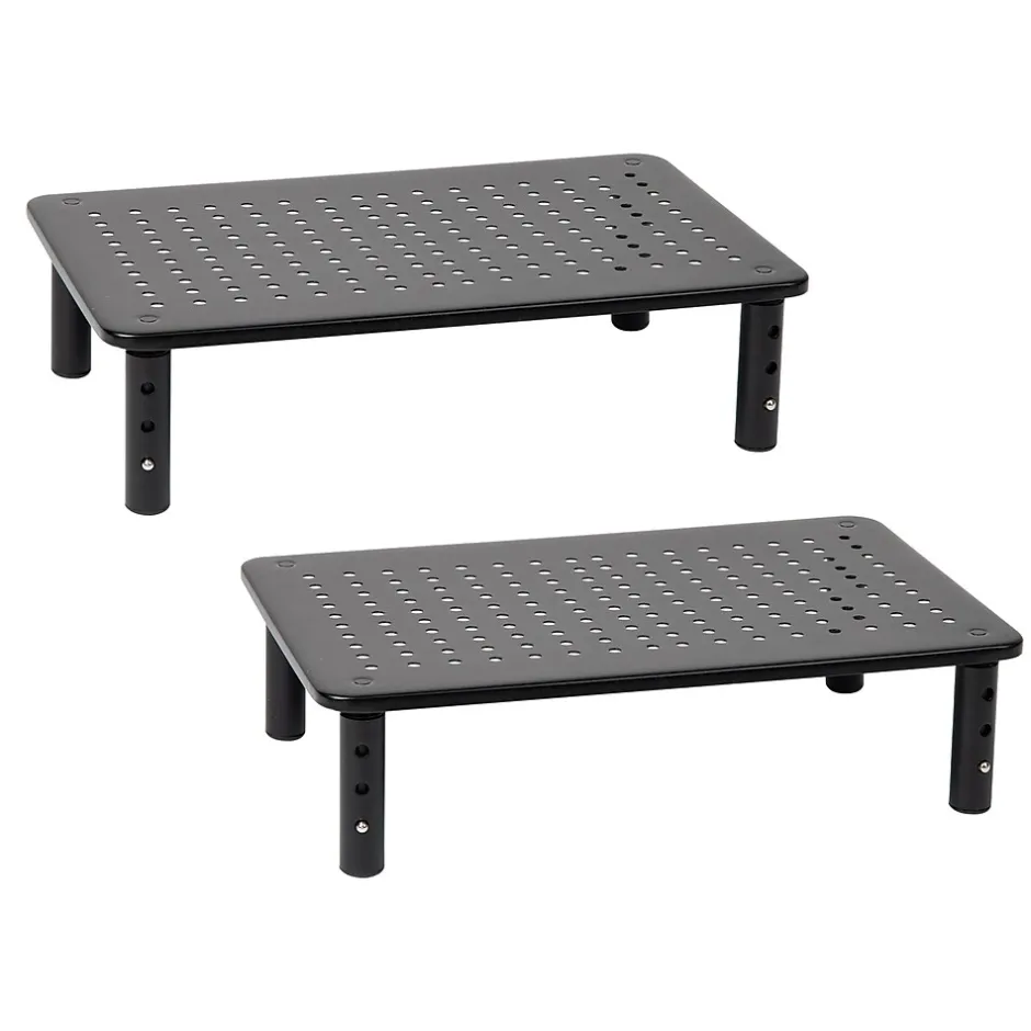 Transform your workspace with this set of two space-saving monitor stands. Whether you need a base for your computer monitor, flat-screen TV, or laptop, this stand is the perfect solution. Crafted from sturdy metal, it is lightweight and easily portable. With a weight capacity of up to 44lb (20 kg), it can comfortably support your devices.The stand features a ventilated design that allows air to circulate underneath your electronics, preventing overheating and enhancing performance. For added security, non-slip feet ensure the stand stays firmly in place. The added height allows you to adjust the viewing angle of your screen, minimizing strain on your neck and back. Work or game for longer periods without the discomfort that comes from poor posture.But that’s not all. This stand doubles up as a storage solution, providing ample room underneath to store office supplies, folders, and papers. By elevating your monitor, it helps declutter your workspace, creating a more organized and productive environment.This monitor stand makes an ideal gift for students moving into dorm rooms, new homeowners, or anyone looking to upgrade their workspace.
