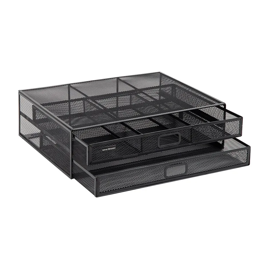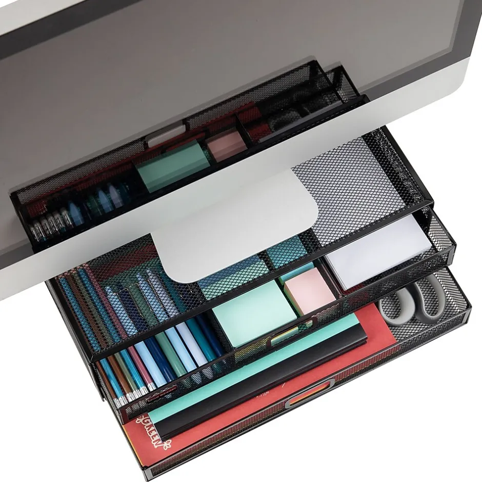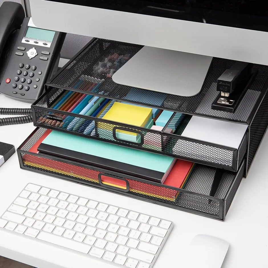 Enhance your workspace with our two-tier desktop organizer and monitor stand. Capable of holding up to 40 lbs. (18.1 kg), it’s perfect for securely supporting desktop electronics such as laptops, notebooks, monitors, printers, and can even double as a TV stand.The organizer features a durable metal mesh construction, which ensures that it withstands daily use. Non-slip grips on the bottom of the stand keep it firmly in place, ensuring your items stay secure and stable. Weighing in at just 4.4 lbs. (2 kg), it’s also extremely portable and can easily be moved to wherever you need it.Maximize your organization capabilities with two tiers of drawers. The top tier is ideal for storing files, folders, and other important documents, while one of the pull-out drawers features three separate compartments for storing office essentials like pens, pencils, and paper clips. The see-through design lets you quickly locate what you need.This desktop organizer is a great addition to your office setup and blends in perfectly with the rest of the Network Collection. It also makes an excellent gift for graduations, birthdays, holidays, and other special occasions. Boost your productivity and keep your space tidy with this versatile desktop organizer.