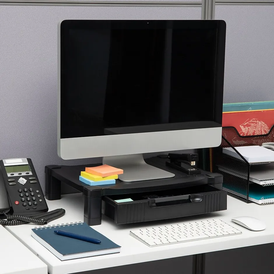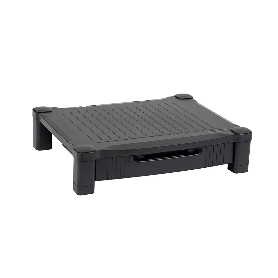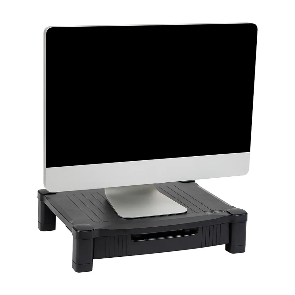 Enhance your workspace with this ergonomic monitor riser designed to alleviate neck, shoulder, and eye strain by raising your monitor to eye level for better posture and comfort. The compact and efficient design saves valuable desk space by providing storage for your modem, notebooks, tablet, and other accessories, while the built-in drawer keeps your documents and essentials organized.Featuring a sleek and modern design, this black monitor stand riser blends in with existing electronics and decor, and the cable management system keeps cords neat and tidy. Built to last with a sturdy resin polycarbonate construction, this stand supports up to 22lb (10kg) and features surface-gripping feet for stability.Measuring 17.25 x 13.25 x 4 inches and weighing 3.48 lbs, the monitor riser stand is ideal for most devices and offers generous storage space for essentials. A perfect gift for students, home or office workers, or anyone with a computer monitor, this riser stand and other Anchor Collection products can transform your workspace into a more comfortable, organized, and efficient environment.