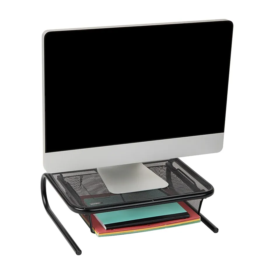 Maximize your work efficiency and reduce discomfort with this ergonomic monitor stand. Elevating your monitor or laptop to the appropriate height helps you maintain good posture, reducing strain and discomfort on your neck and shoulders. The sturdy mesh metal construction of this monitor stand ensures it can withstand the weight of most standard monitors and laptops, making it a durable addition to your workstation.Not only does this monitor stand provide a comfortable viewing angle, it also doubles as a desktop organizer to help you maximize your workspace. With a slide out drawer tucked underneath your monitor, you can easily access and store files, memo pads, and other office supplies. You can even tuck your keyboard under the stand to free up more desk space for other tasks.The sleek design of this monitor stand adds a touch of ambiance to your office, making it a stylish and functional addition to any workspace. The rubber-coated supports on the bottom of the monitor stand keep the it securely in place, while the space-saving design makes it a great gift for anyone in need of a more comfortable and organized workstation.Whether you’re a student, professional, or anyone who spends a lot of time in front of a computer monitor, this monitor stand and organizer is the perfect way to enhance your productivity and reduce discomfort.